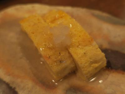 ・先付け: 鎌倉人参のポタージュスープ、小坪の太刀魚のフリット、鴨ロースが出ました。どれもちゃんとおいしかったのですが、この中で特に驚きだったのはスープです。人参が入っているとは全く想像できない味だったので。フルーツ人参でも使ったのでしょうか?