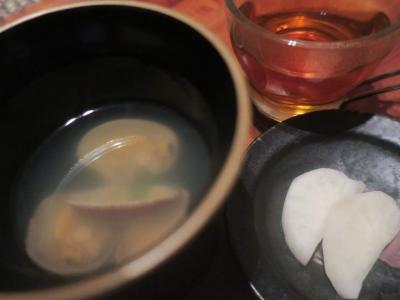 まず、お重はコンパクトなものでしたが、その中は盛りだくさんで、数の子、鮑、紅白の蒲鉾、鴨ロース、海老、伊達巻、鰆の西京焼き、卵の黄身の味噌漬け、からすみ、黒豆、そして大根と人参を器用に結んだものが入っていました。また、これは作り置きではないようで、味付けは通常のおせちのように濃い目ではなく、会席のような感じになっていました。