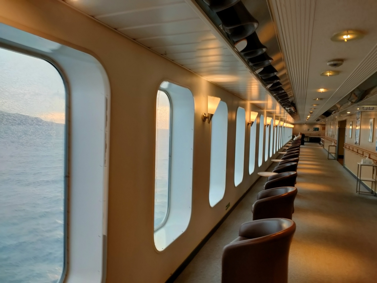 船後方に外に出られるデッキがあって、甲板横の屋外通路が天候が悪くて閉鎖されている場合でも、結構、外に出られる場合があります。