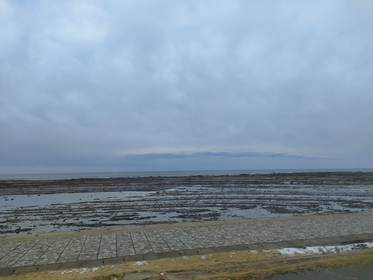 海岸沿いに平坦な鬼の洗濯岩のような磯が続いています。磯に海水がたまり、日が当たると水鏡になって、特に夕日のころは良いそうですが、訪れた時は残念ながら雪模様の日でした。