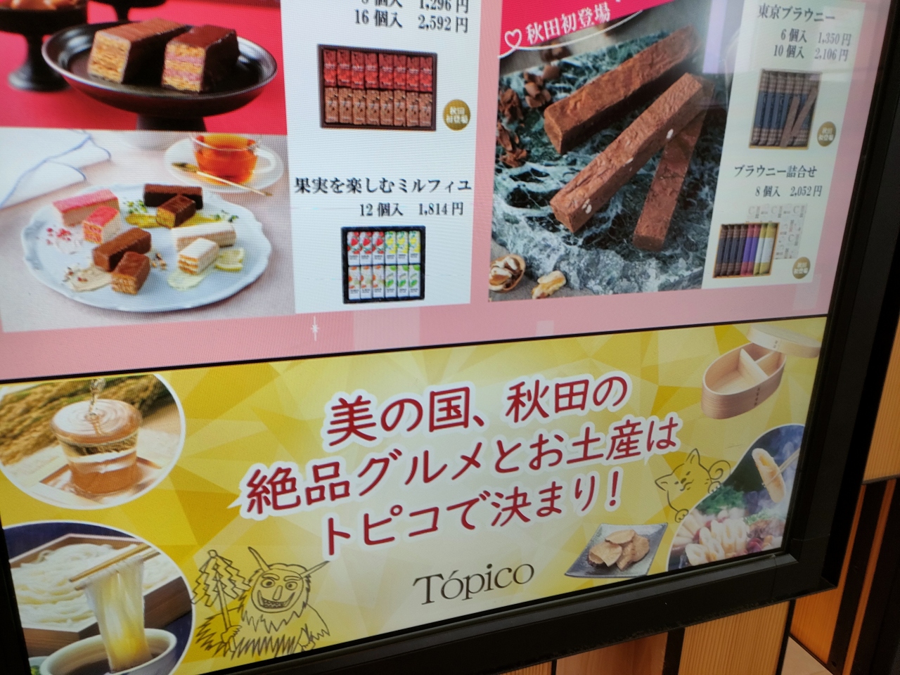 秋田駅でのお土産調達は、駅ビルのトピコとコンコース改札向かいのNewdays、待合室内のこまち苑が手軽で便利です。