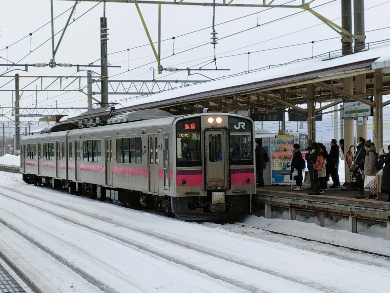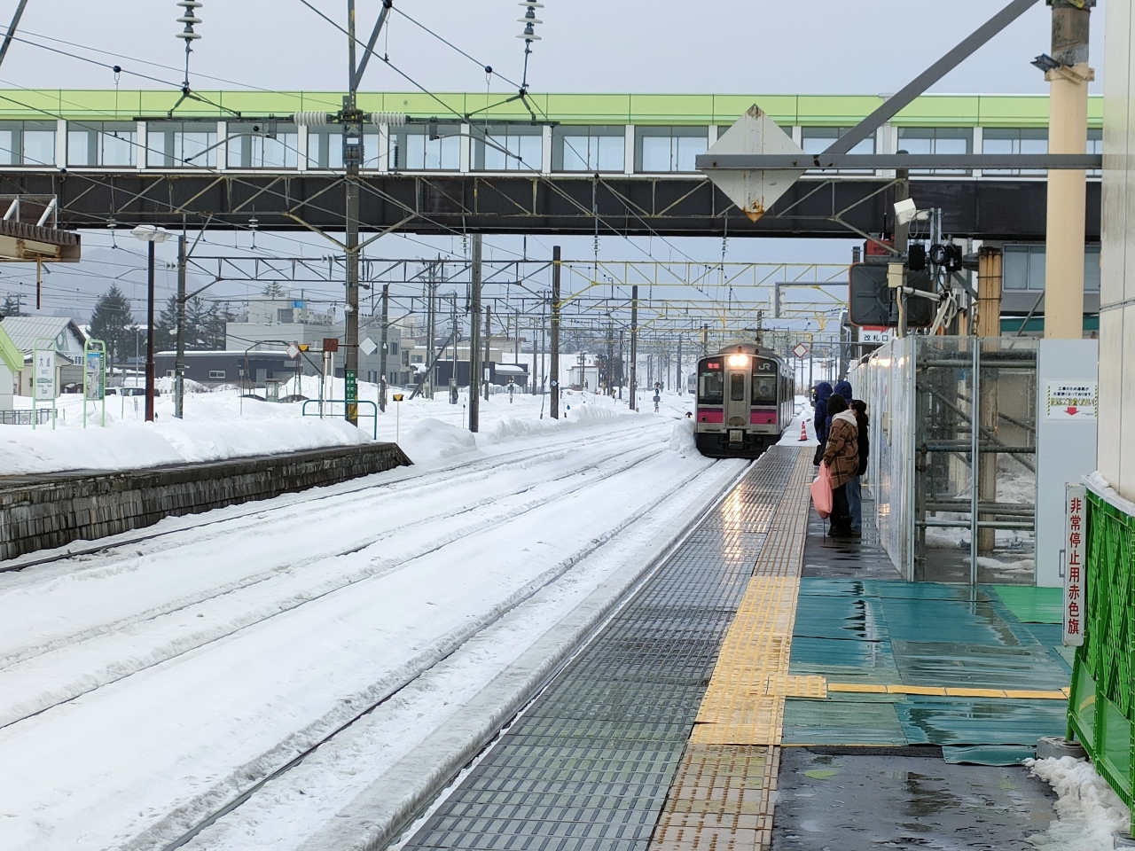 秋田・東能代方面は、一部、屋根付きの古いホームが残りますが、列車は屋根の無い側に停車することが多いようで、天気の悪い日は不便極まりありません。