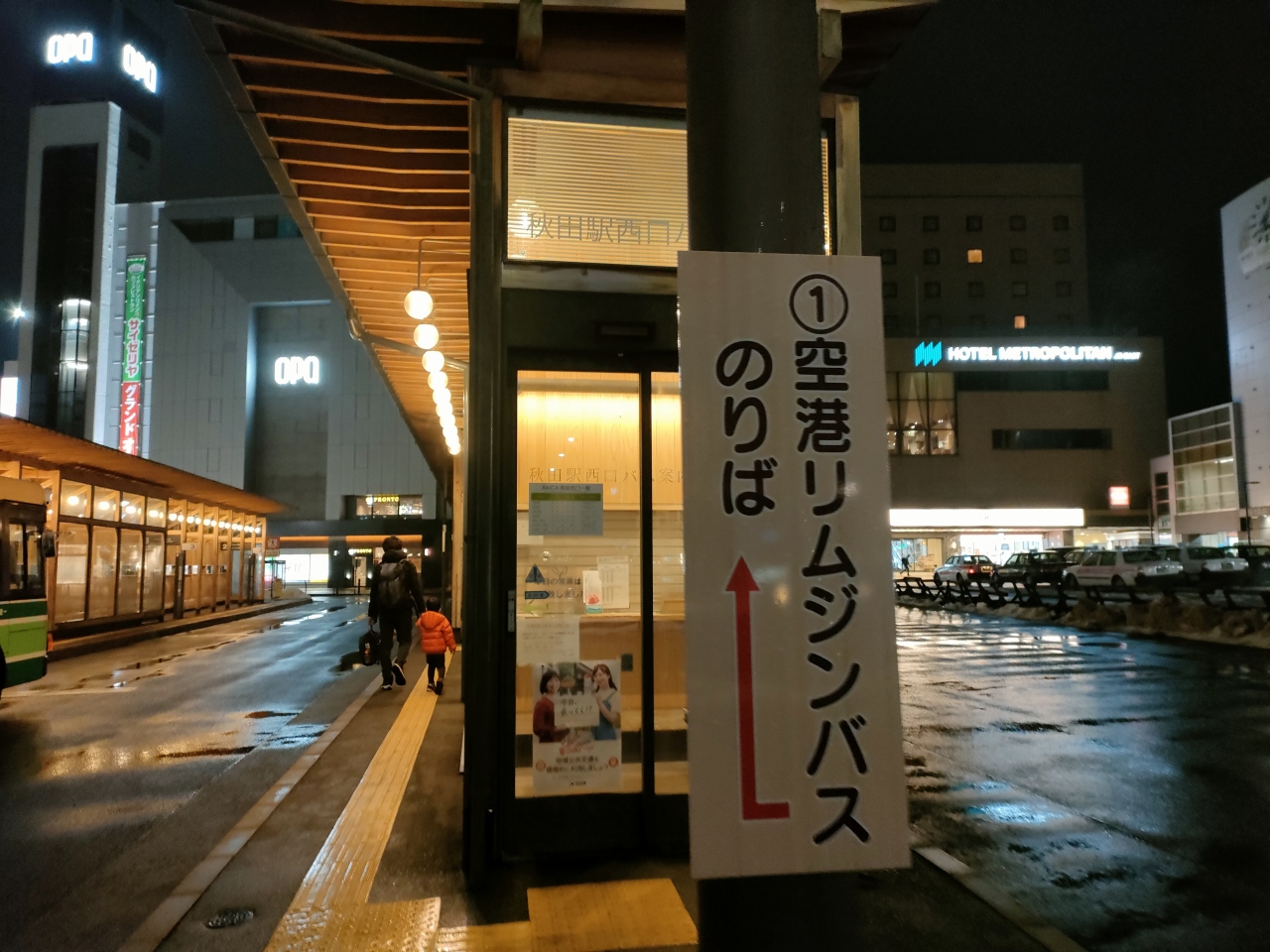秋田駅西口、千秋公園側はバスプールになっていて、駅ビル側に近い1番乗り場からは、秋田空港行きのリムジンバスが飛行機の出発時刻に合わせるように、おおよそ1時間に1~2本程度の頻度で出ています。