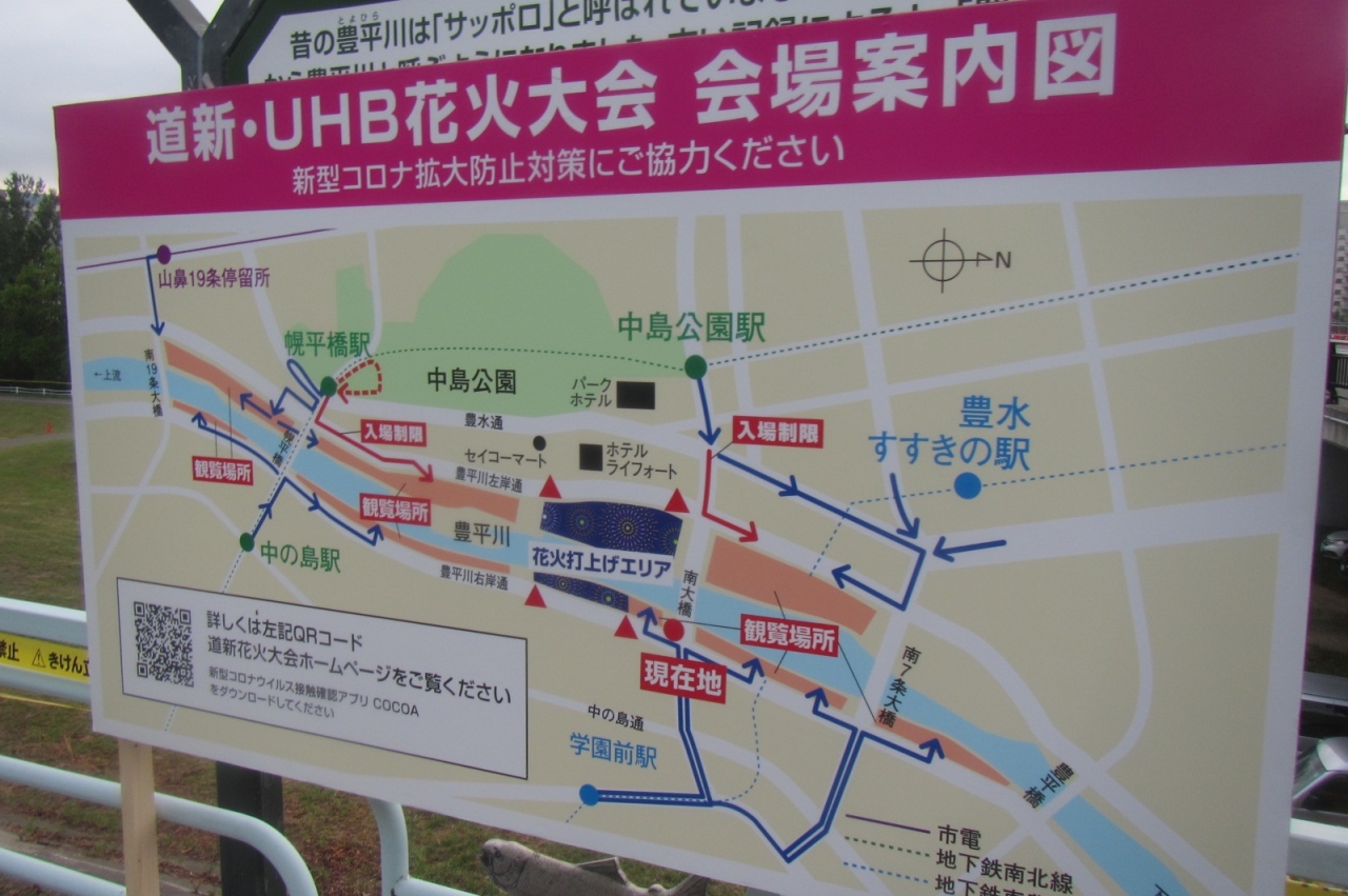 人出はすすきの・中島公園側の左岸が混雑し(特に幌平橋付近)、花火の正面も左岸側のようで、解説放送が左岸側でかかっていました。