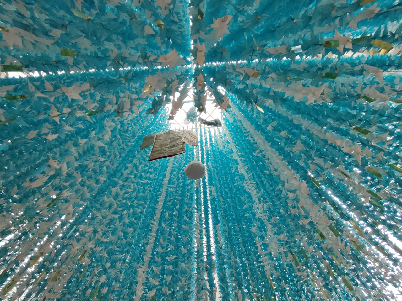 中央通りと一番丁通りとの交差点(マーブルロードと一番町商店街との交差点)には、爽やかな色合いの何千・何万羽もの折り鶴で作られた巨大な飾りが下がって、中に入って上を眺めると神秘的な雰囲気も漂っていて、多くのお客さんが立ち止まって眺めていました。- 旅行時期