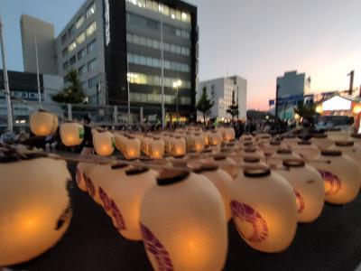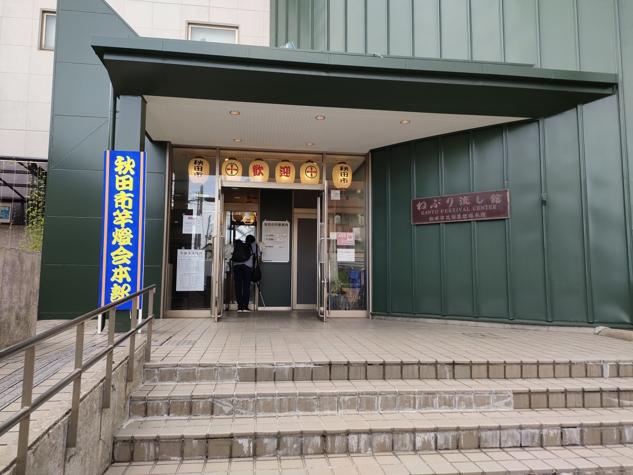 竿灯まつりの会場(夜本番)は、秋田駅から1kmほど先にある竿灯大通で(徒歩20分くらい)、秋田駅側の旭川沿いの有楽町通りとの交差点から、県道56号線との山王十字路までの800mあまり。