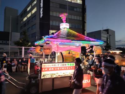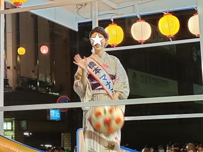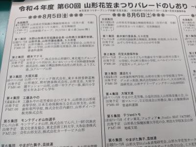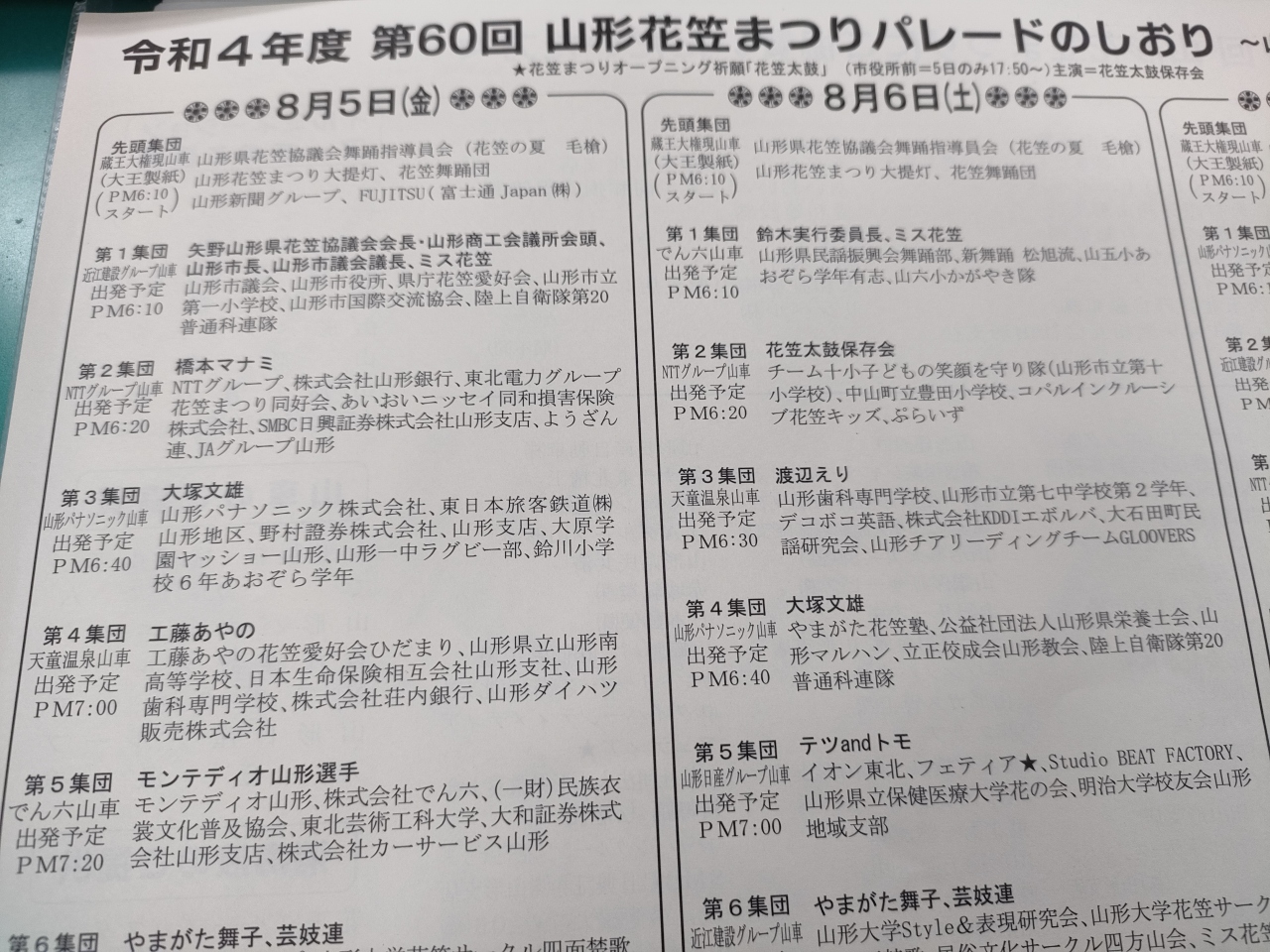 その年のゲストは事前に発表されるようですが、訪れた時は、駅や観光案内所などに置いてある何種類かの花笠まつりのパンフレットの中に祭り各日の山車に乗るゲストの一覧が記載されていて、毎年かつ毎日登場している大塚文雄氏や、毎年出演の橋本マナミさんなどが今年も来ていました。