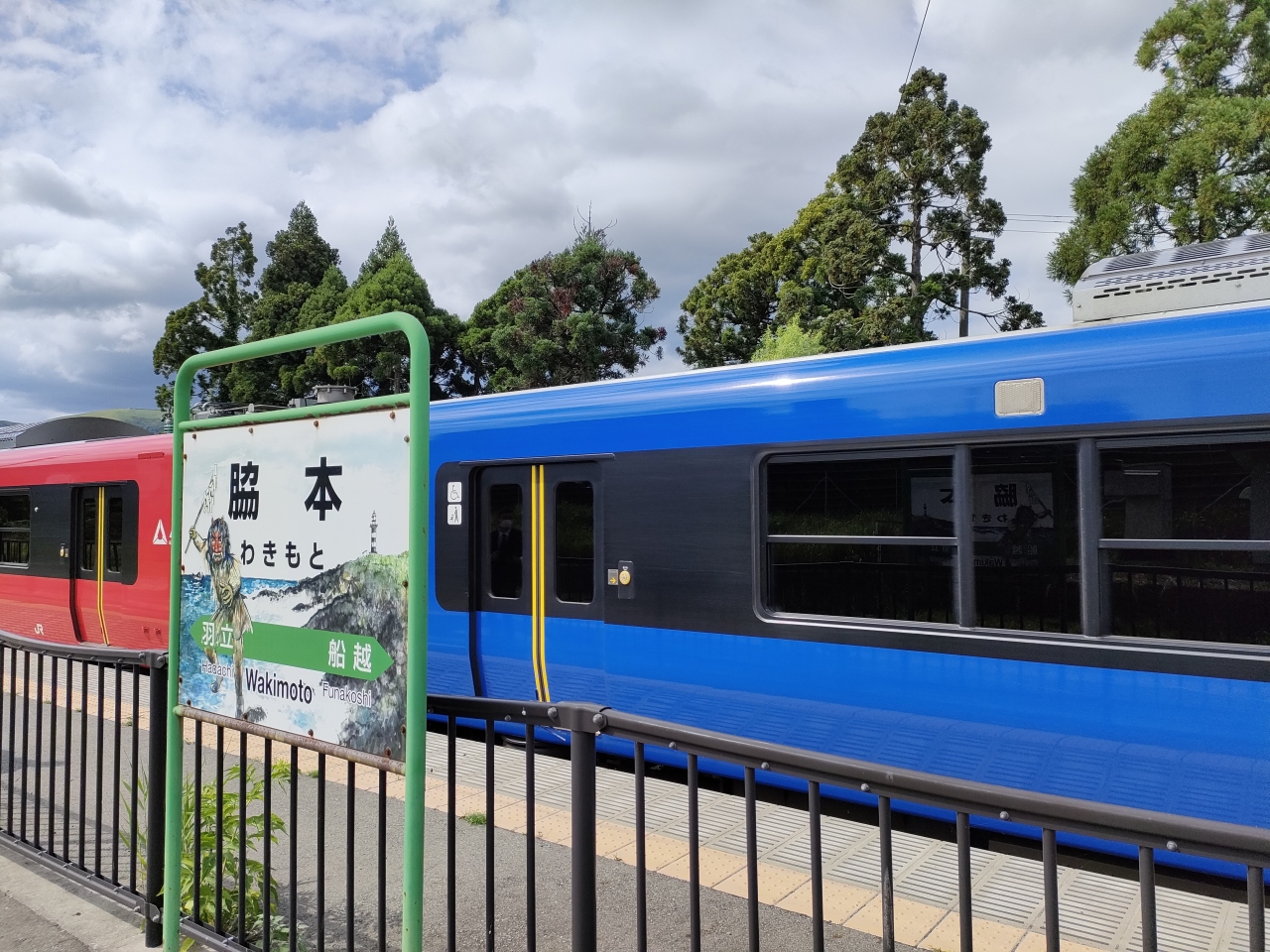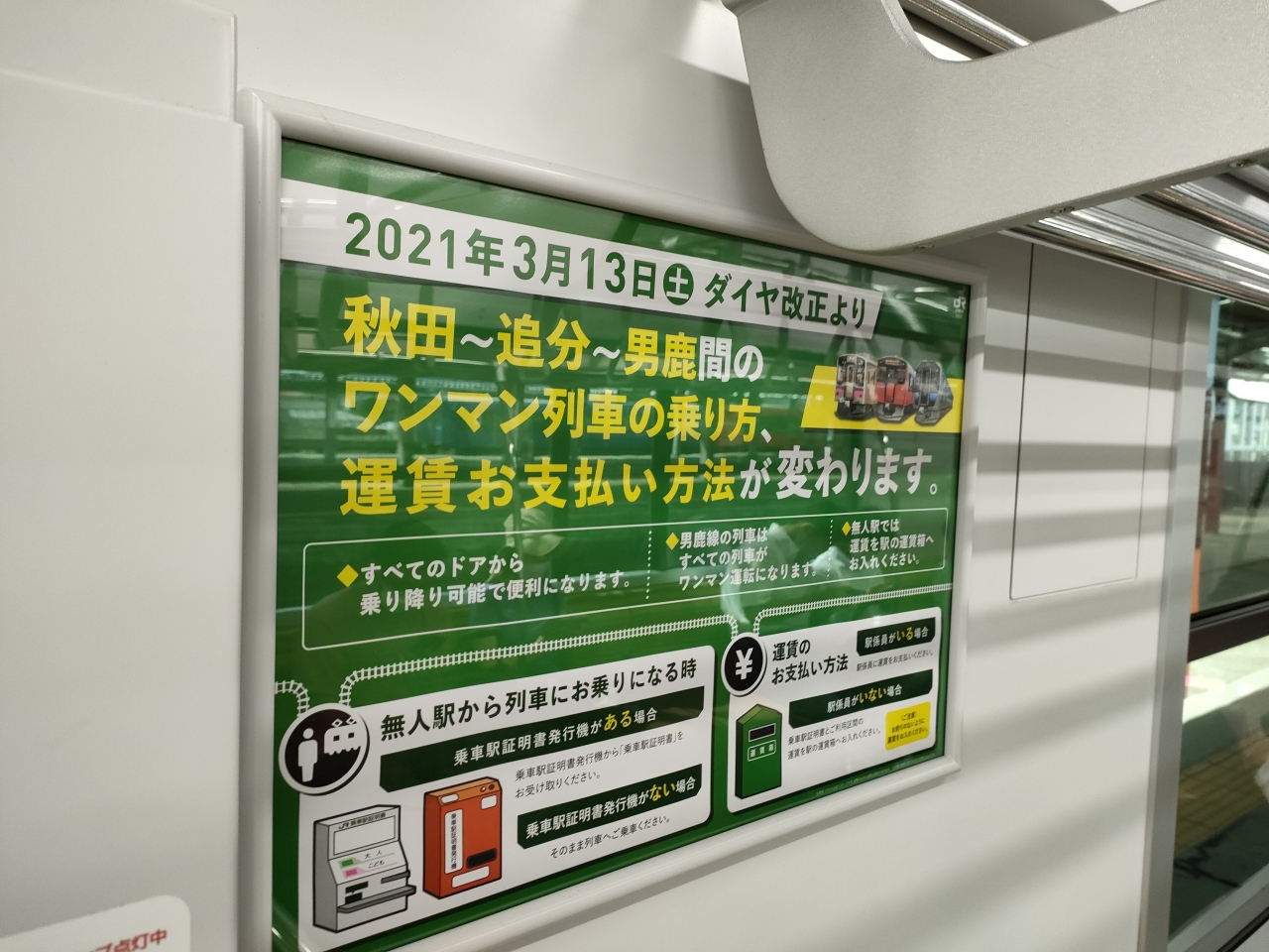 追分駅から終点男鹿駅まで単線の26.4kmで、行き合いなどにより36~40分くらい。