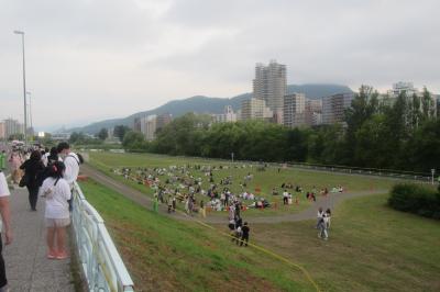 夕食を済まして30分前頃に訪れる人が多いので、早くに訪れていれば、条件の良い場所を確保できます。30分前頃は河川敷に下りる道路上は、立ち見客がびっちり密集して大混雑していました。