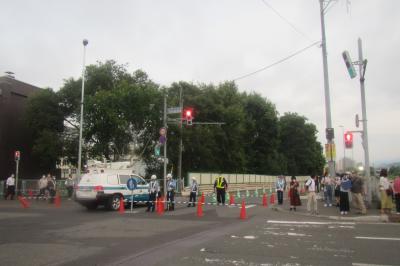 橋上・橋の袂には交通規制の警察官が立ち、通行者の誘導を行っていたほか、車両の規制が始まると、カラーコーンとバーで行く手が遮られたほか、道路の真ん中に大型の護送車が立ちはだかって完全封鎖されていました。