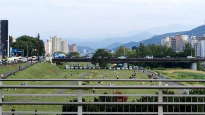 ・河川敷の草原に下りてしまえば比較的間隔やスペースが空いている。