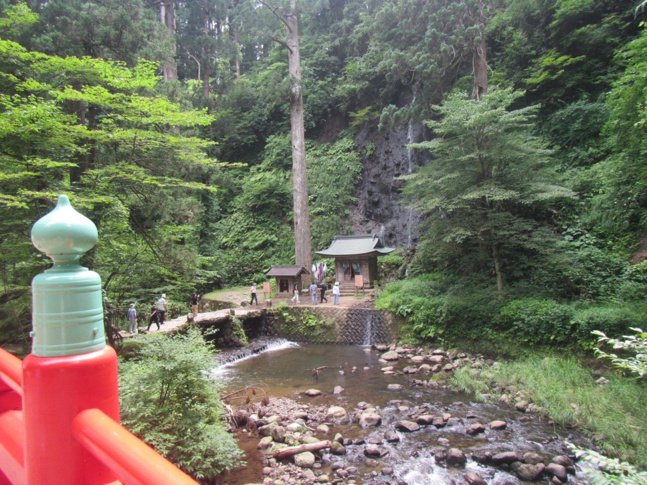 羽黒山神社の五重塔に向かう途中、神橋を渡ると橋上から祓川神社の祠と背後の須賀の滝が見えます。