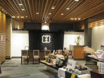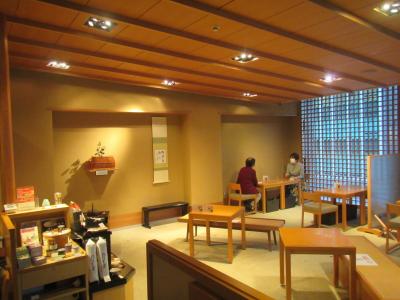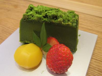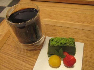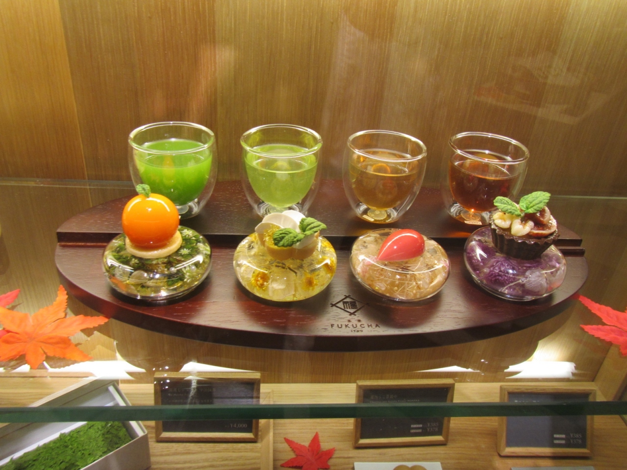 お茶の福寿園だから当たり前と言えば当たり前だなと思いつつ、はてスイーツは? 場所を間違えたか? …と迷っていたところ、その敷居の高そうな専門店のお姉さんが案内してくれて、スイーツはエレベーターか階段を上がった別の階でいただけるそうです。