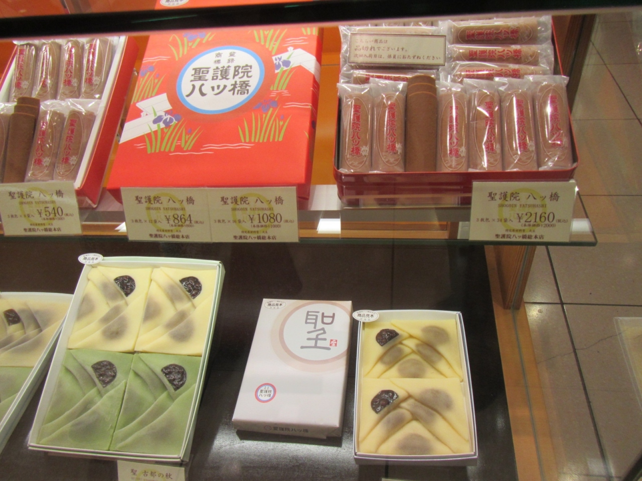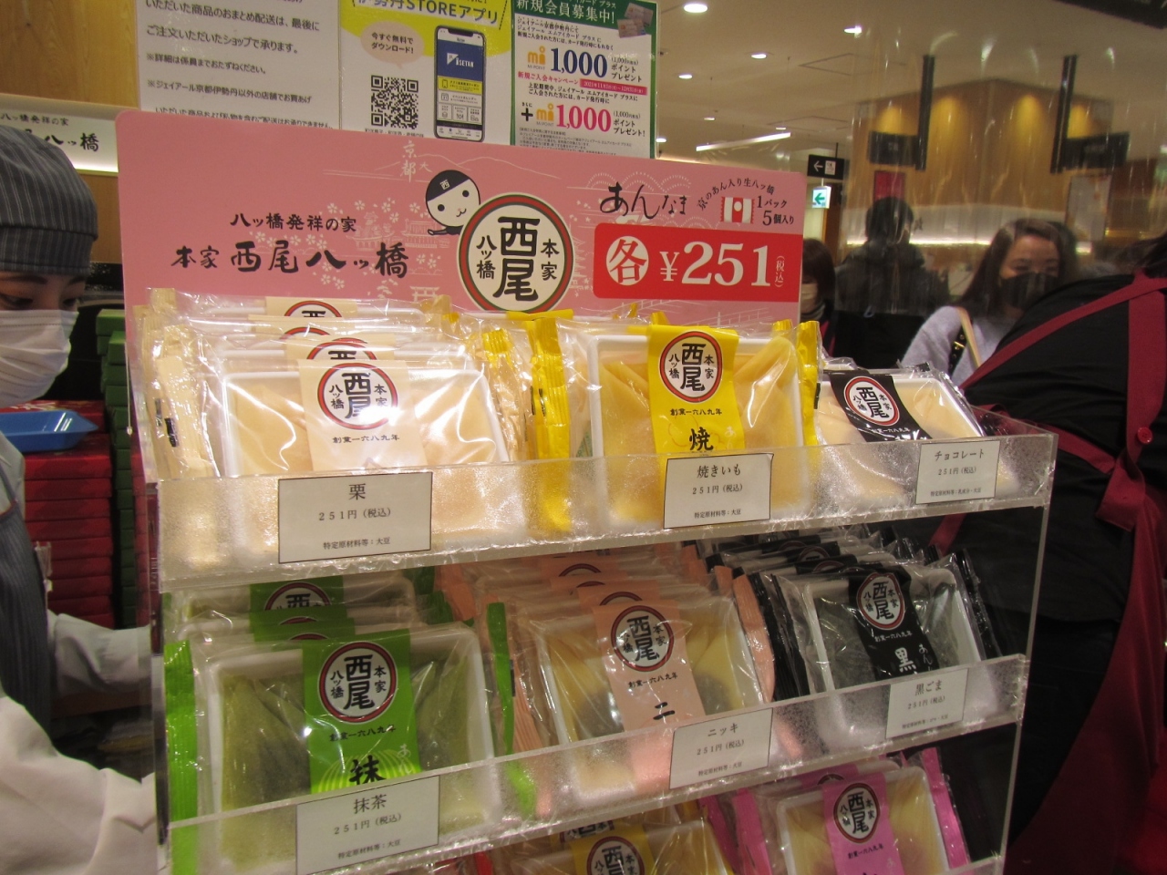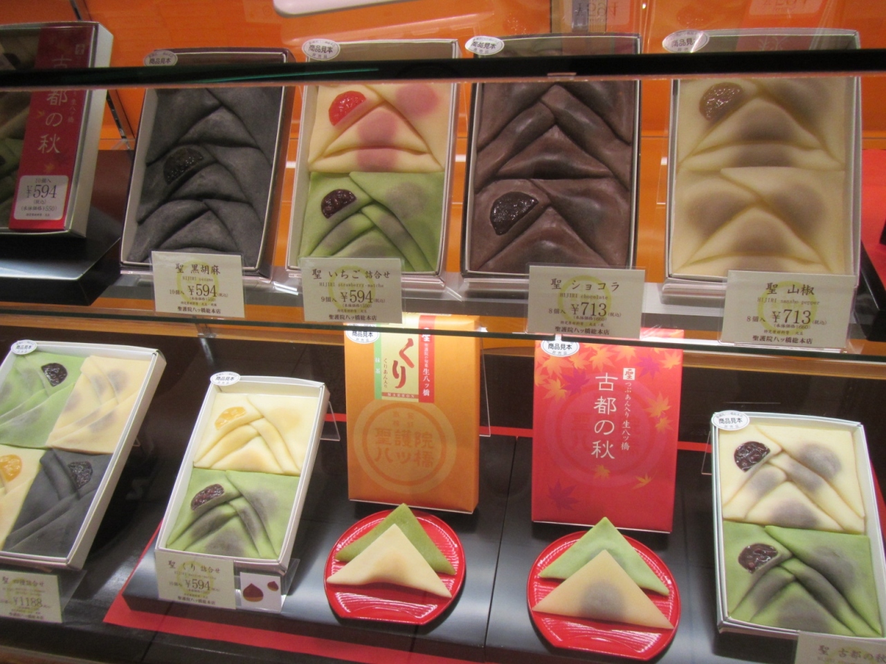 辺りには井筒、聖護院など八つ橋・生八つ橋を販売するお店がかたまってあり、どちらも基本のニッキや抹茶の生八つ橋に混ざって、特徴的な味の生八つ橋が取り混ぜられて置かれています。
