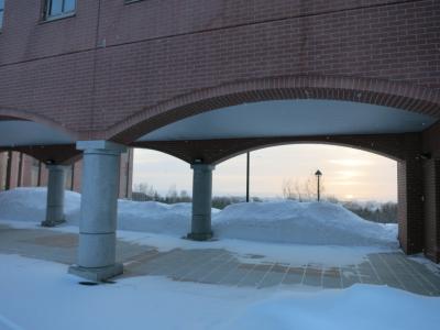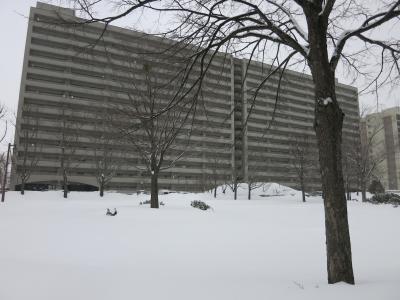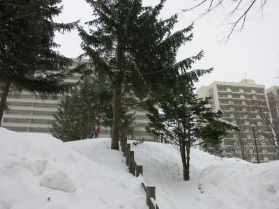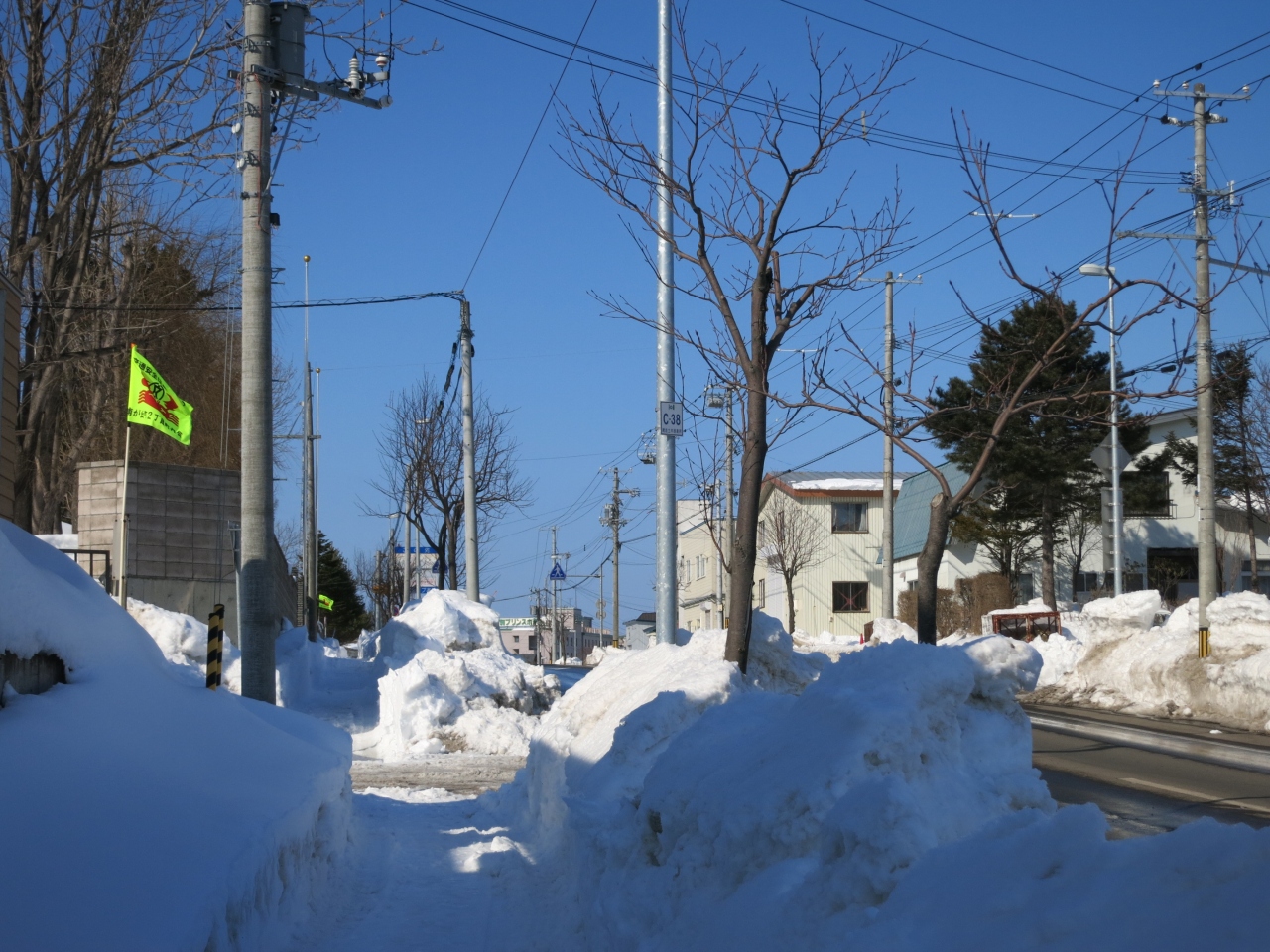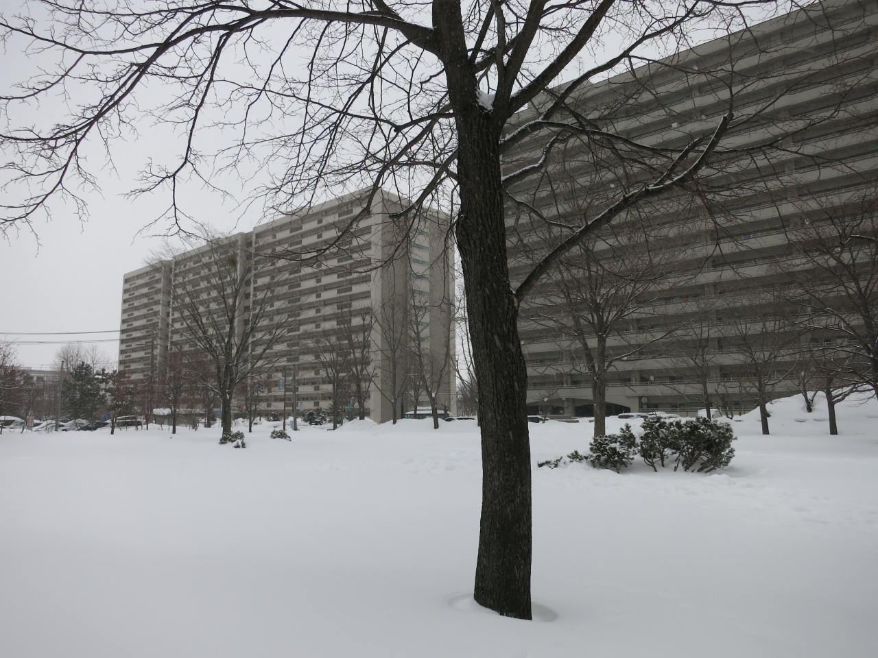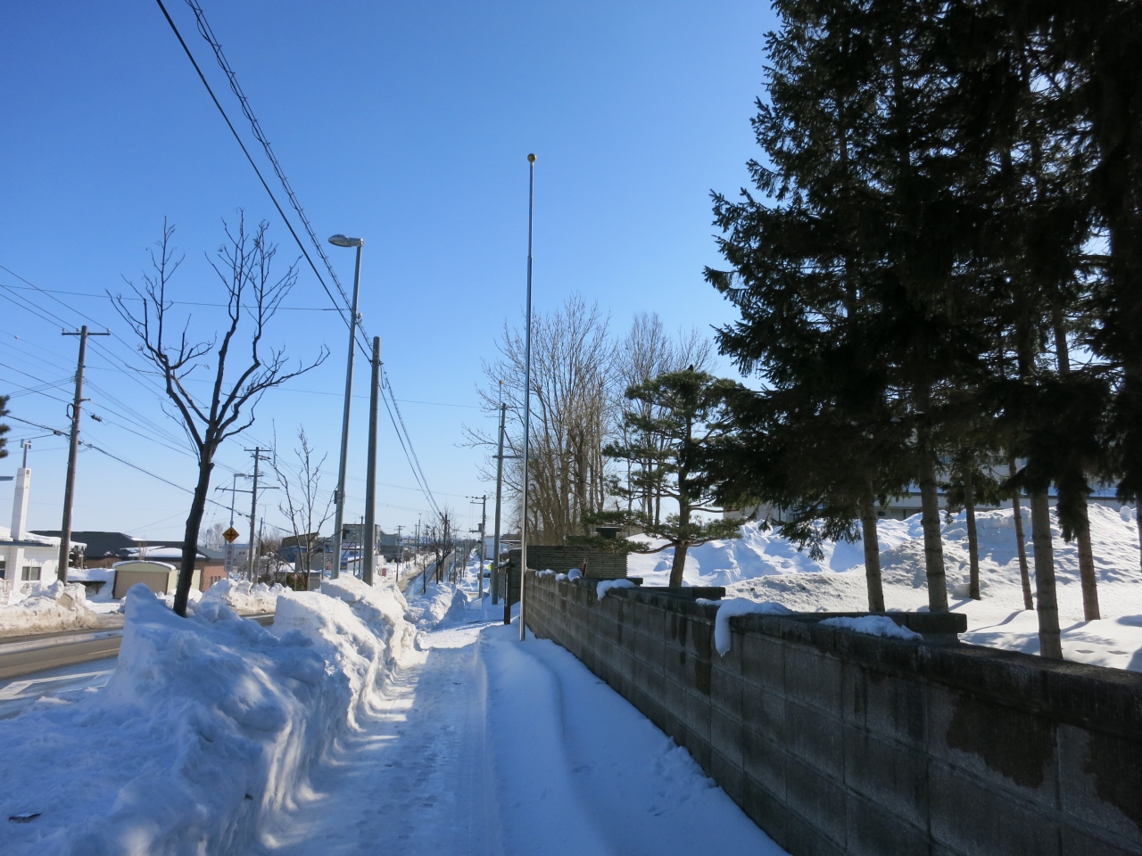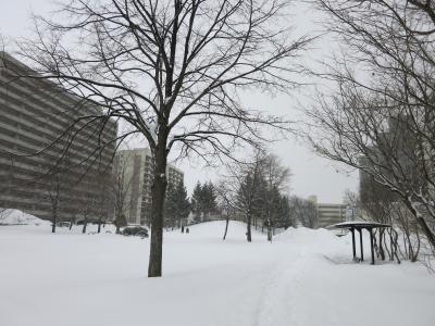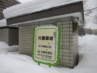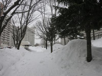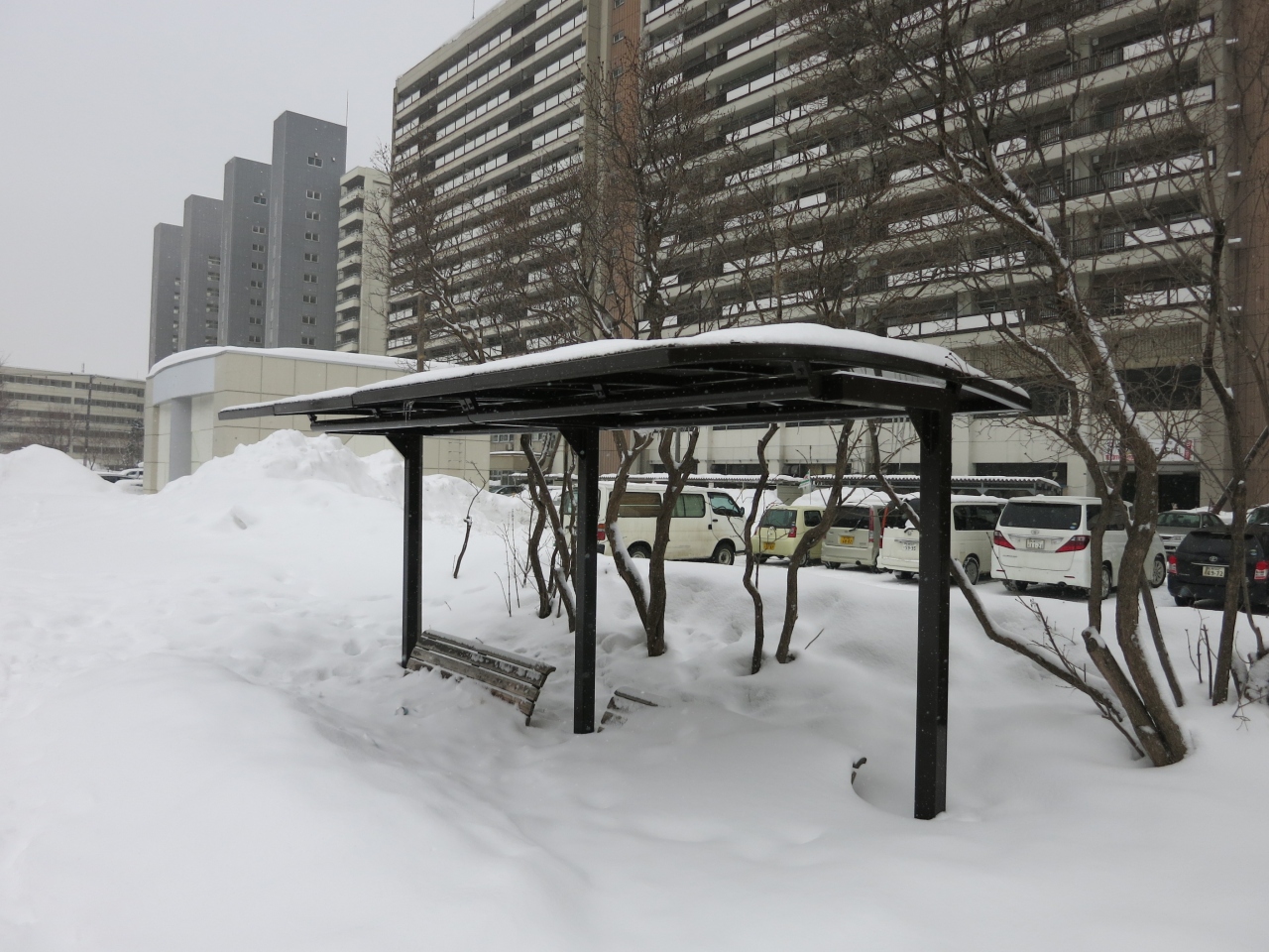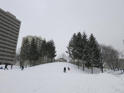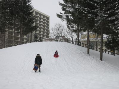 周辺の似たような小さな公園は、冬は雪が積もり、どこも除雪はされていませんが、ここの公園は、小さな子どもなどが家族連れで遊んで、雪が踏み固められていました。市営住宅のマンションに挟まれている場所柄のせいもあるのかもしれません。
