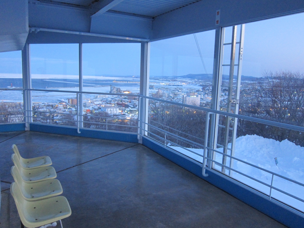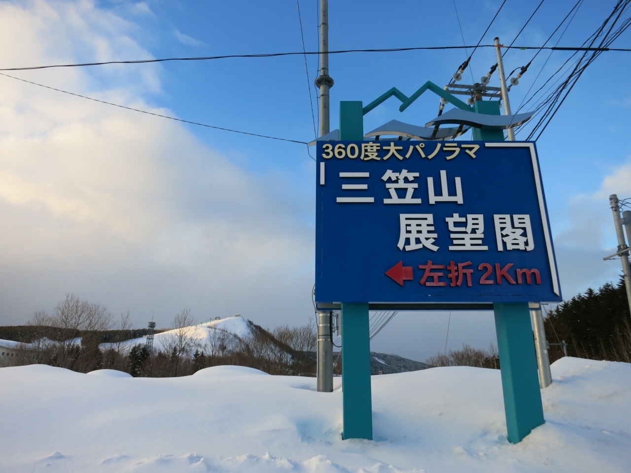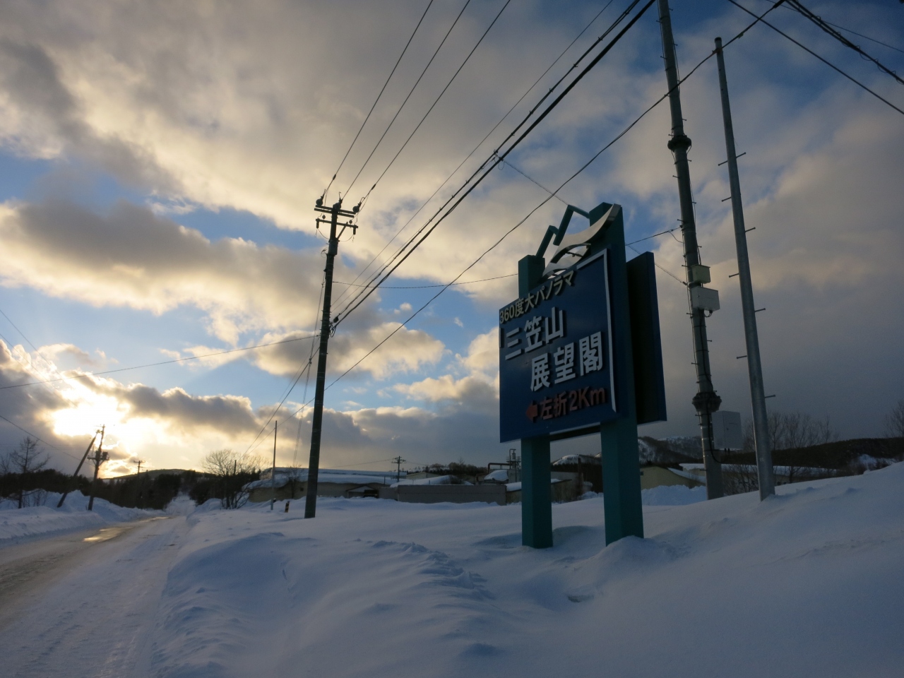 枝幸の街を見下ろす三笠山(172m)の山頂にあります。開館時期は5月~10月。入館無料。山の南側に山頂までアクセスする道路があり、国道238号線のホテルニュー幸林から500mほど南側にある信号のところから山の方へと向かいます。流氷の様子を眺めようと、山頂に向かおうとしましたが、冬は途中の山へ向かう分岐から除雪がされていません。途中まではスキーの跡がありましたが、中腹の分岐からは、それすらもありません。正面の三笠山スキー場のリフトでのアクセスとなります(展望閣は閉まっていると思いますが)。