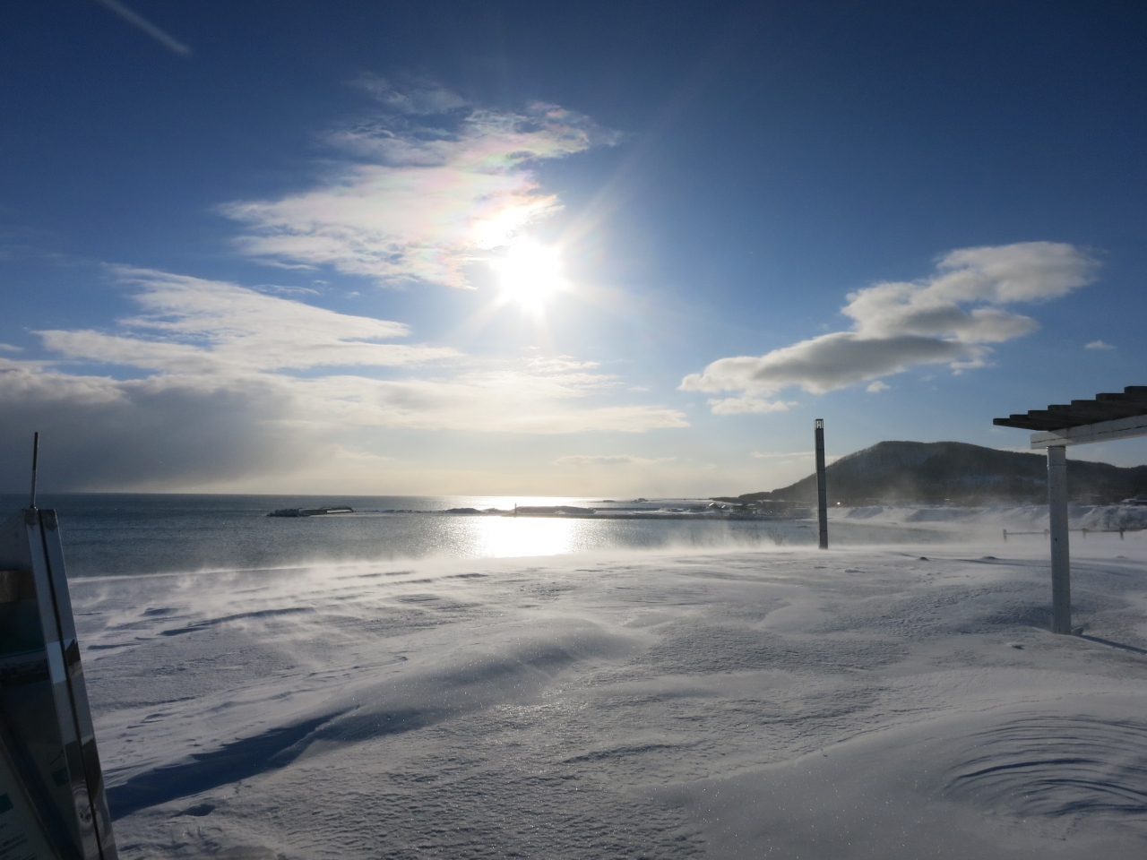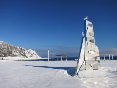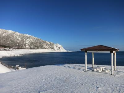 岬の南側の238号線沿いに神威岬公園があります。あづま屋やベンチ、トイレなどがあり、岬全体を横から眺めることができます。ただ、冬は除雪などはされていないようです。ベンチは雪に埋もれ、トイレも閉鎖されていました。強い風で積もった雪が飛ばされて、残った雪は凍っていましたが、踏みどころを外すと、膝のあたりまで埋まってしまいます。