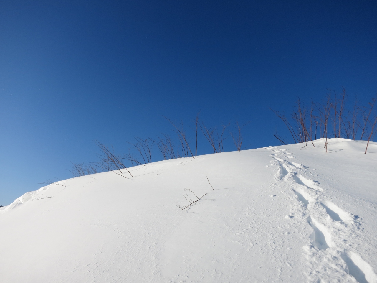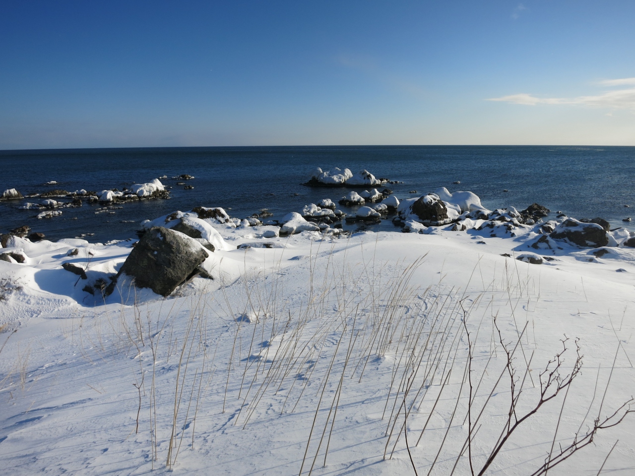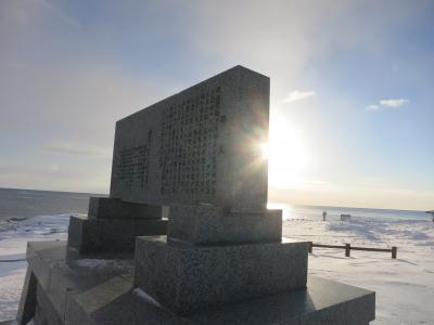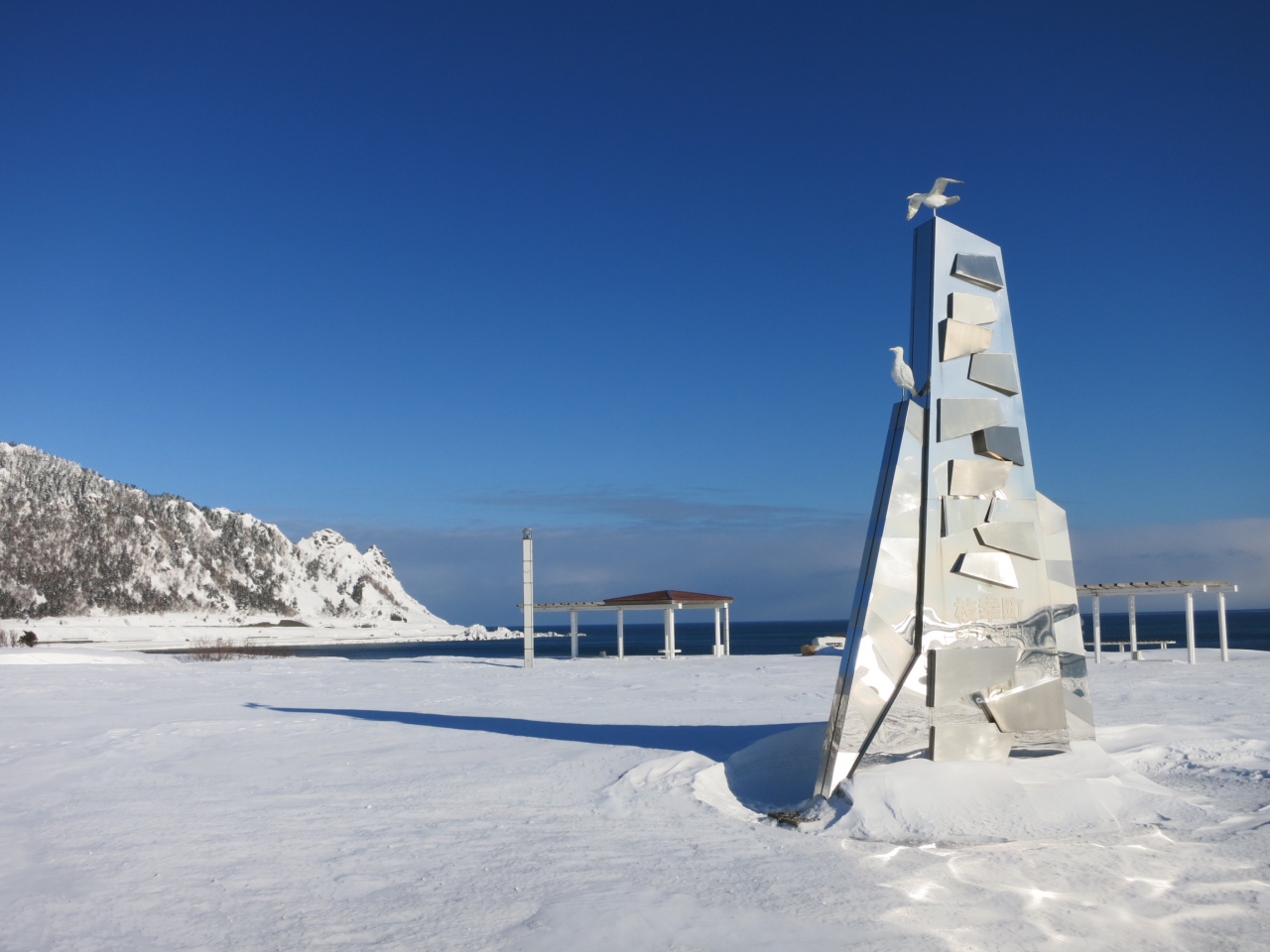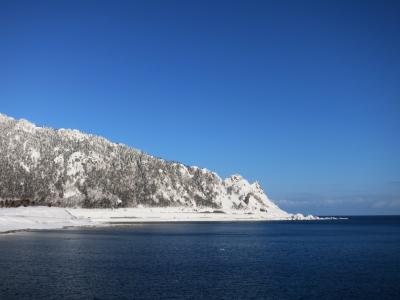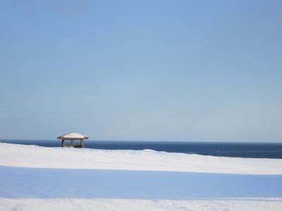 北の海、オホーツク海にせり出した岬。冬は流氷が押し寄せる…はずだったのですが、訪れた時はすでに去った後。それでも青空の下、-4℃の凍える風が吹き付ける中、岬の先端に白い雪を被った岩が立っていました。