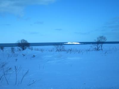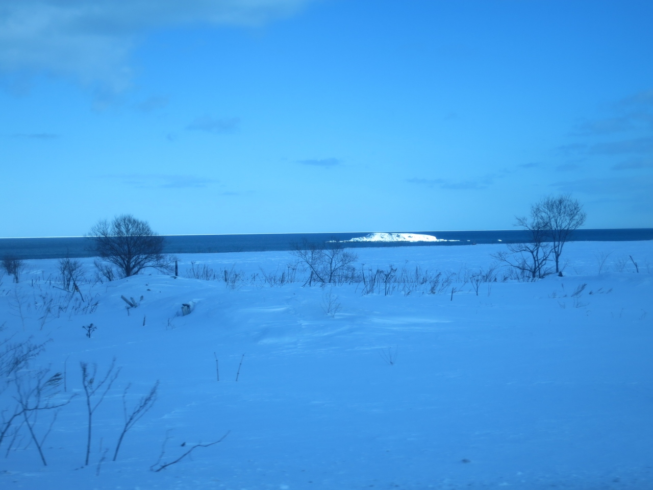 冬はウスタイベ海岸には流氷が押し寄せ、白い雪の積もった千畳岩と呼ばれる磯づたいの柱状剥離の岩は、流氷の塊とあいまって、まさに千畳続く大平原…のはずなのですが、訪れた時は、流氷は影、形すらも見当たりませんでした。海上保安本部の海氷速報( http://www1.kaiho.mlit.go.jp/KAN1/drift_ice/cgi/ice_inform.cgi?mode=cal )などで日々の様子を確認していて、前週までは良い感じだったのですが、まだ2月の下旬に入ったばかりだというのに、枝幸ではこのような状況。時期はその年の天候にもよるのだと思います。1980年代を節目に、近年は流氷の量も減っているといい、網走やウトロの方ならともかく、宗谷方面での接岸を見るのは、遠方からの旅人にとっては難しくなってきているのでしょうか。