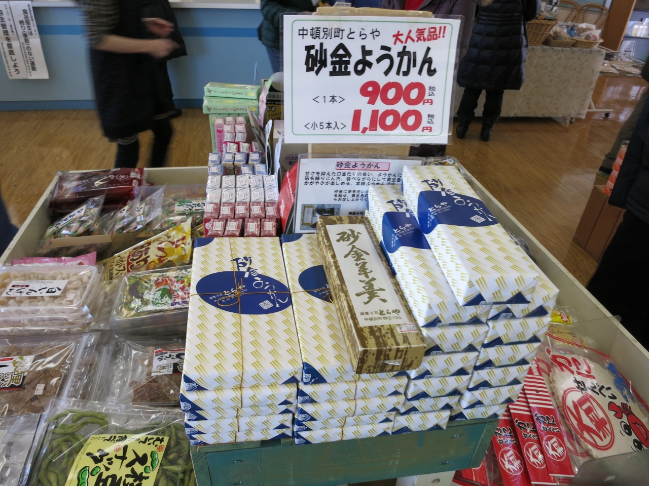 道の駅には、お土産コーナーもあり、枝幸のお土産のほか、稚内や北海道のお土産も置いてあり、訪れた観光バスツアーの人達が買い求めていました。「はまなすクッキー」は、この店オリジナル。蒸しケーキの「かに食べ放題」や、「カニぱい」などは枝幸限定のお土産だそうで、他にも「かに祭りせんべい」や「木いちごジャム」、「しころハチミツ」(「しころ」=キハダの木)、海産物加工品などが売られていました。枝幸で作っている訳ではないようですが、流氷の神威岬のラベルがきれいな「えさしワイン」(赤・白)というのもありました。また、中頓別町の「砂金ようかん」も気になりました。- 旅行時期