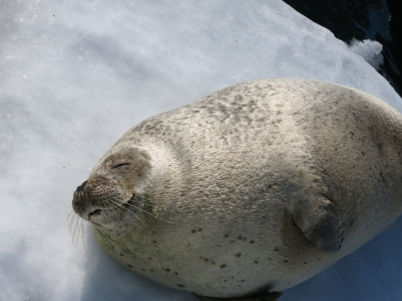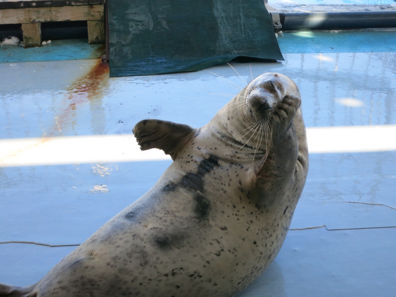 犬みたいに人懐っこく、エサをねだっています。寝転がったり、ポーズをとったりと愛嬌ふりまくり。最後は、飼育員さんの誘導でアザラシに触ることができます。