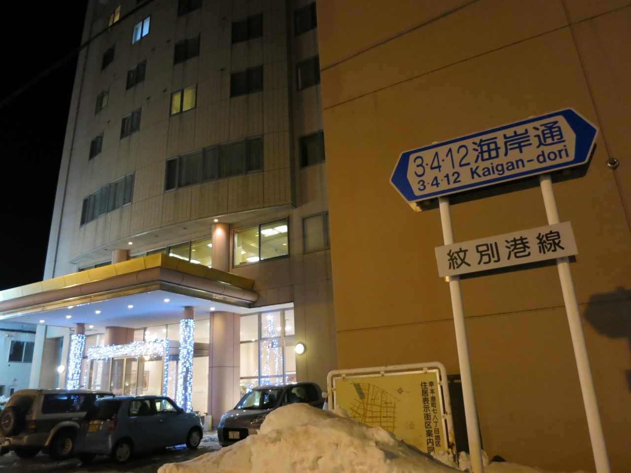 紋別の主要な3つのビジネスホテル(セントラルホテル、プリンスホテル、ホテルオホーツクパレス)のうちの1つで、そのうち最も港に近いところにあります。海までは200mほど。バスターミナルからは400~500mほどのところです。