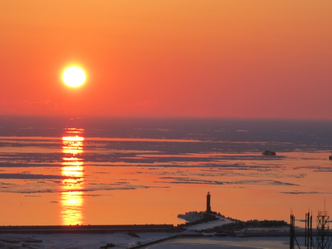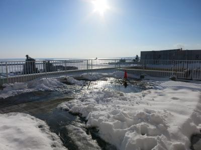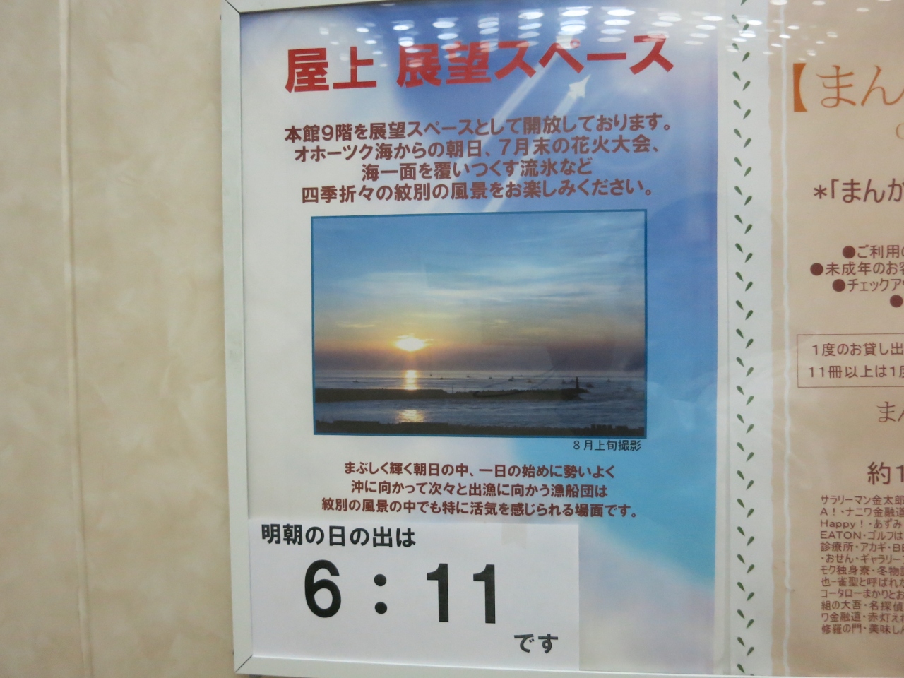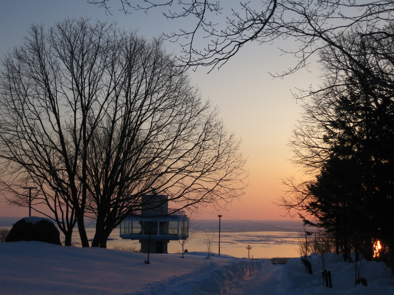 9階の屋上に展望用のテラスがあり、シーズン中は手軽にオホーツク海の流氷の様子を確認できます。特に朝の日の出の頃が良いようで、エレベーターの中に当日の日の出の時刻が張り出されていました。もし、気力があれば、紋別公園や紋別山頂まで出かけていくと、より高くスケールの大きな眺めがみられますが、ホテルは断然手軽で、海が間近です。なお、本館でも、ロビーがある棟の東向きの部屋の場合は、部屋からも海が眺められます。