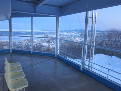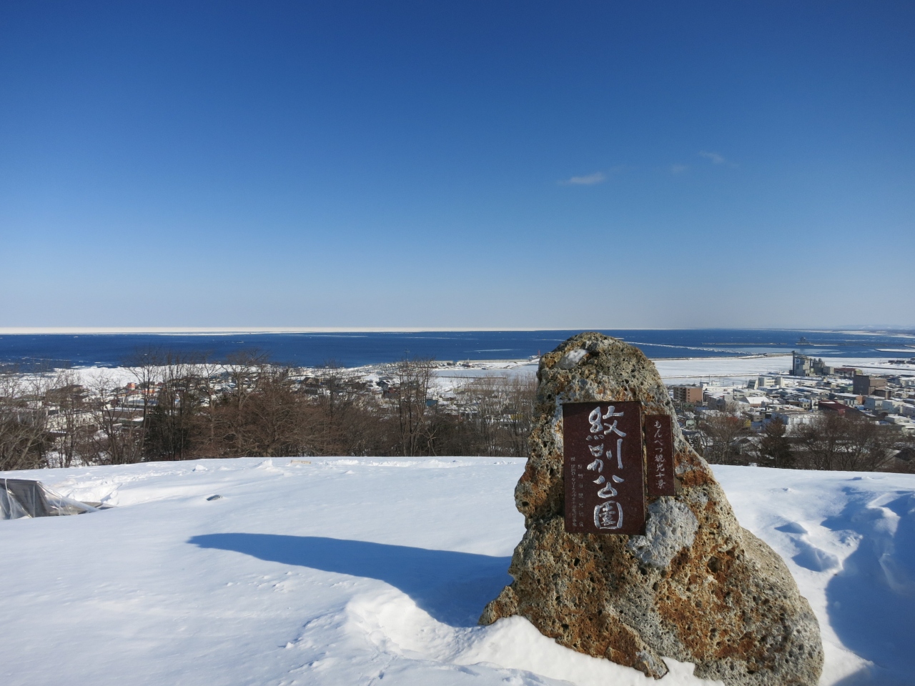 公園は、街の中心部から近く、紋別バスターミナルからは、直線で500mほどの距離。冬場は麓の厳島神社の北隣の細い階段を上がっていくと近いです(やや除雪はされているものの、階段の上には雪が積もっているため足元要注意)。勿論、展望台のすぐ近くまで車で行くこともできます。スカイタワーのある紋別山よりも、中心部に近く、手軽です。