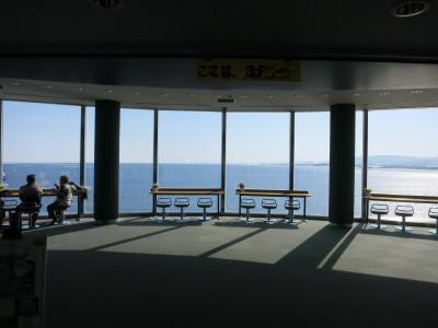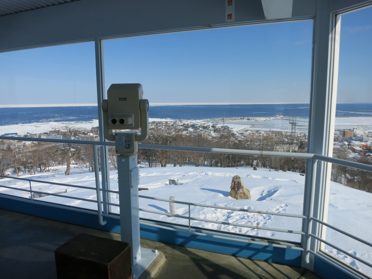 流氷展望台は、無人で無料ですが、無暖房で、ベンチや望遠鏡もある屋内の2階と、屋外の高いところから眺められる3階があります。いずれも360°のパノラマが眺められます。開放時間は8:45~17:30です。もっとも展望台に上がらなくても、オホーツク海や街はよく眺められます。