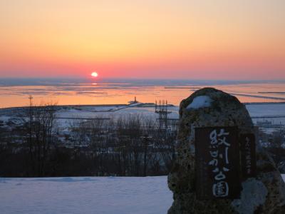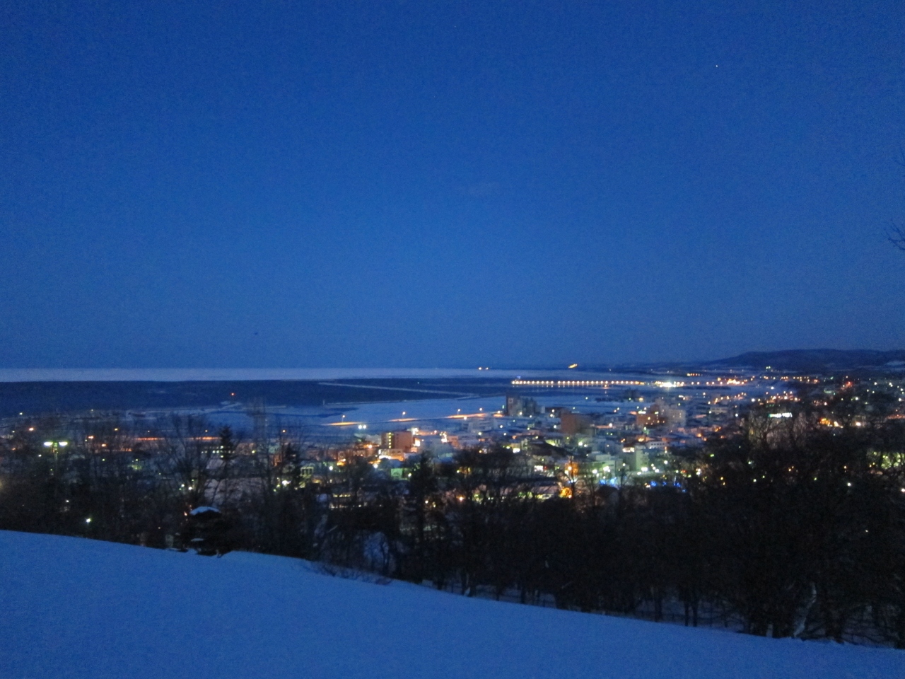 丘の上の、公園の東側にある流氷展望台からの眺めが素晴しいです。特に日の出と夕暮れ、夜景がきれいで、遠くに小さく知床の山々を眺めながら、流氷のオホーツク海から上がる朝日は感動的です。また、夕暮れになずむ流氷と、暗くなるにつれ、明るさを増す眼下の紋別の街並み、そして海に突き出したオホーツクタワーとプロムナードの堤防のライトがきれいに輝く様子などが眺められます。勿論、日中の景色もよく、青空の下、白い雪を被った紋別の街と、ところどころ青い波間をみせるオホーツク海に、遥か遠くまで広がる白い流氷原の様子は、北の地に来た旅情をかきたててくれます。