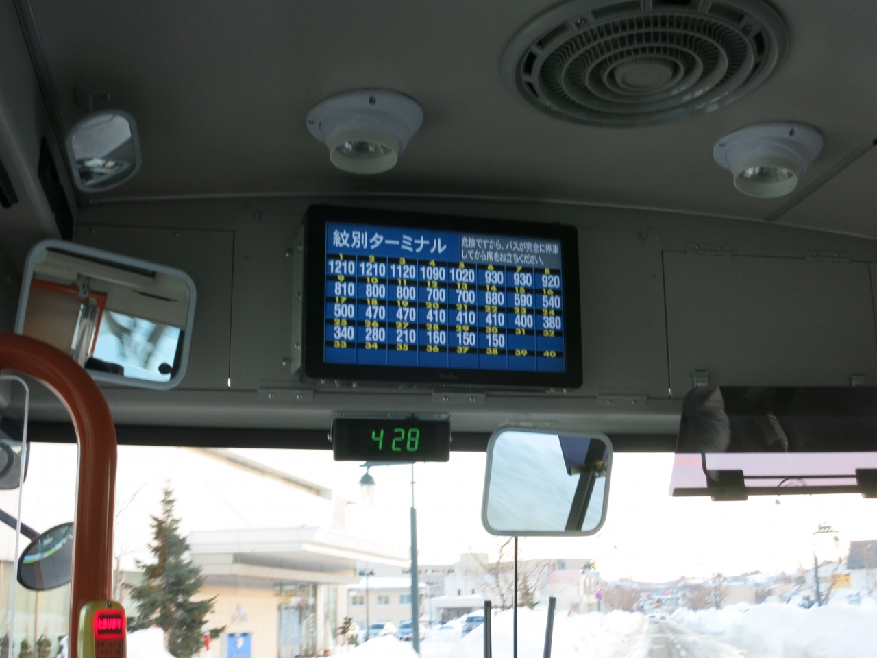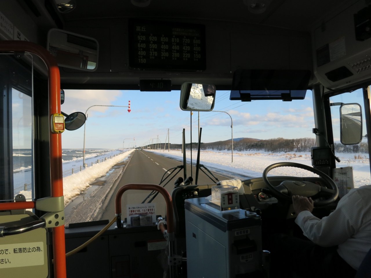 公共交通機関(バス)での移動を考えると、朝食(7時~9時)がとれません。浜頓別・稚内方面は7時30分、雄武・紋別方面は7時10分で、それを逃すと2時間ほどバスは来ません。雄武方面は冬(11月~4月)は特にひどく、次発の第2便は13時です。高速バスは札幌行きが7時、旭川行きが8時15分です。(※2014年2月現在)