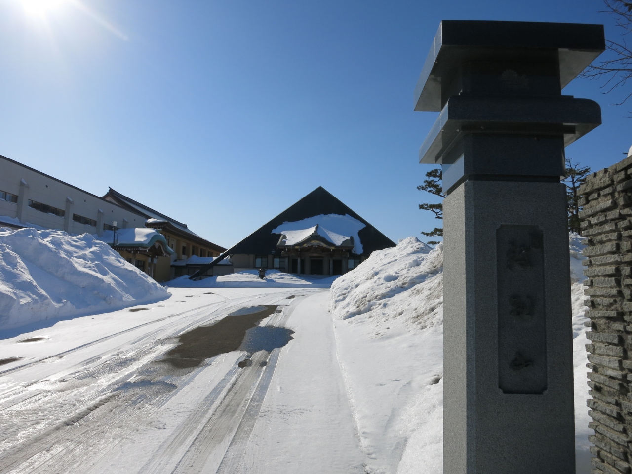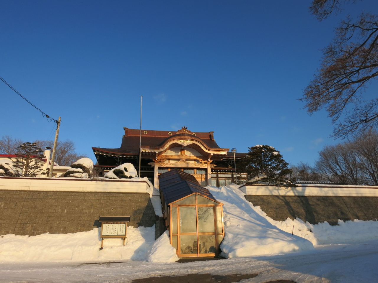 紋別の中心部、紋別バスターミナルや道の駅氷紋の駅の近くにあるお寺で、紋別公園の丘に少し登ったところにあります。