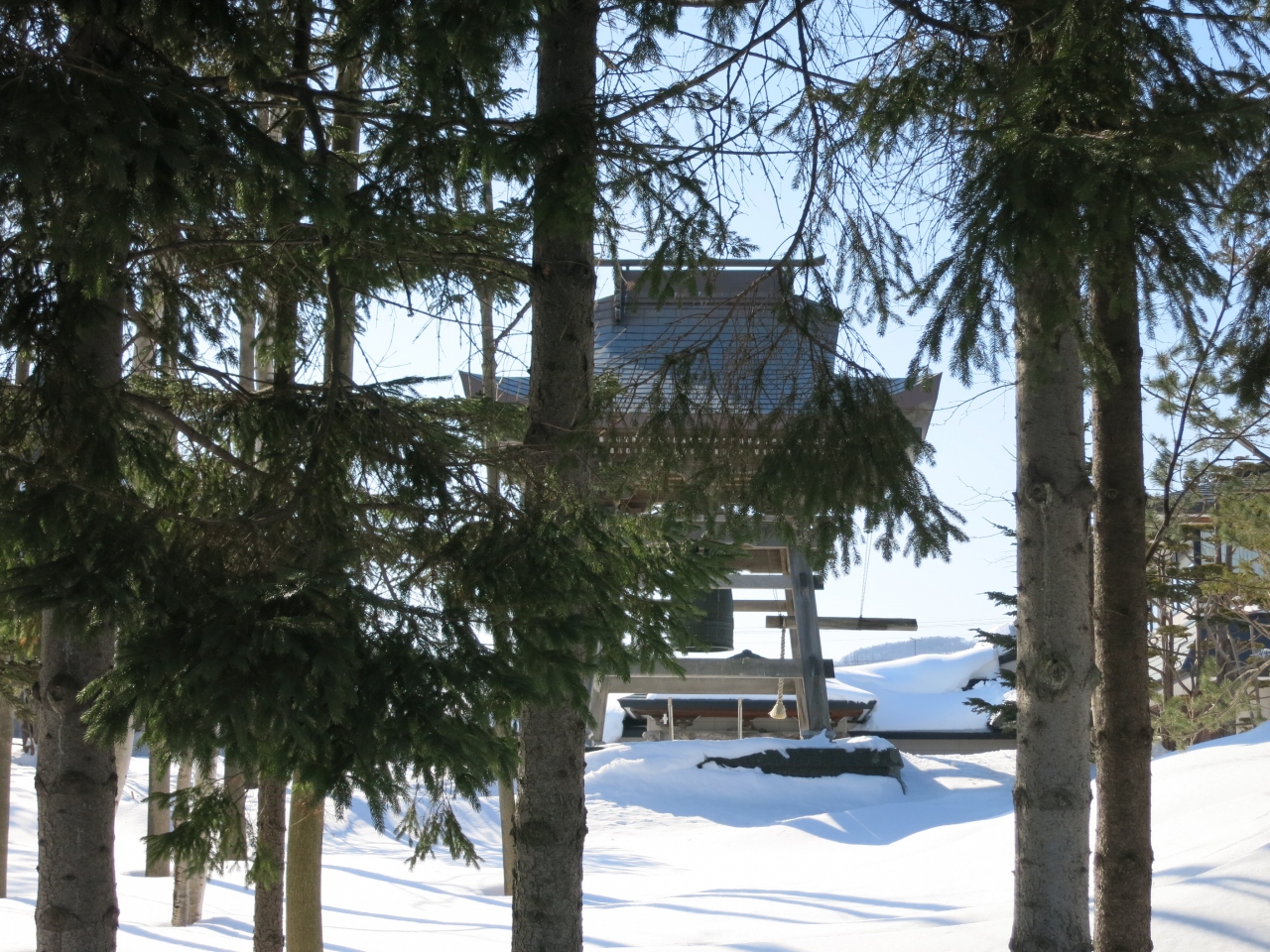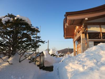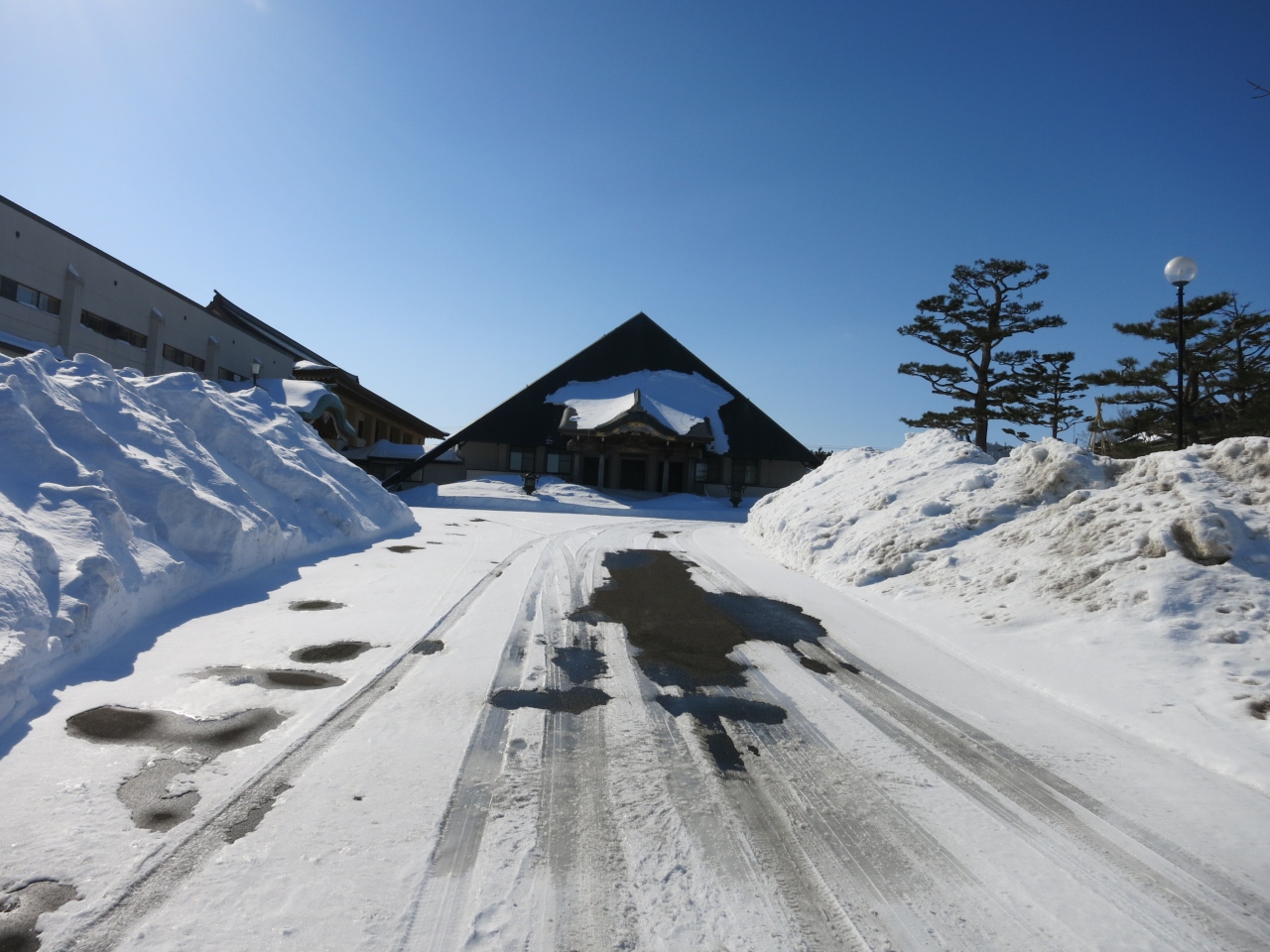 寺と神社の間の通路は除雪されて通れる時期もあったようですが、訪れた時は雪が積もっていて、滝の姿は見ることができませんでした。- 旅行時期