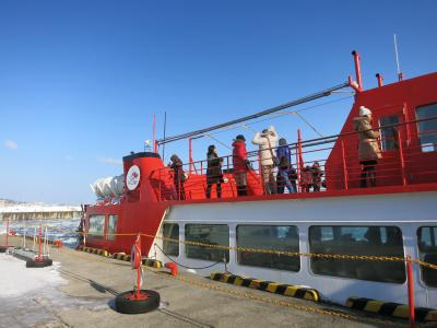 紋別のバスターミナルや主要ホテルから船着場までは、出航時間に合わせた連絡バス、ガリヤ号が出ていますが、出航時間近くに到着するため、乗船の列の後の方になってしまいます。団体ツアーのバスなどはそれよりも早く到着しているためです。しかし、流氷の観賞が始まってしばらくすると、皆、場所を移動しはじめるので、結局はあまり変わらない感じでした。出航の場面から希望する場所があるのであれば、早めに到着して並んでおくことをおすすめします。