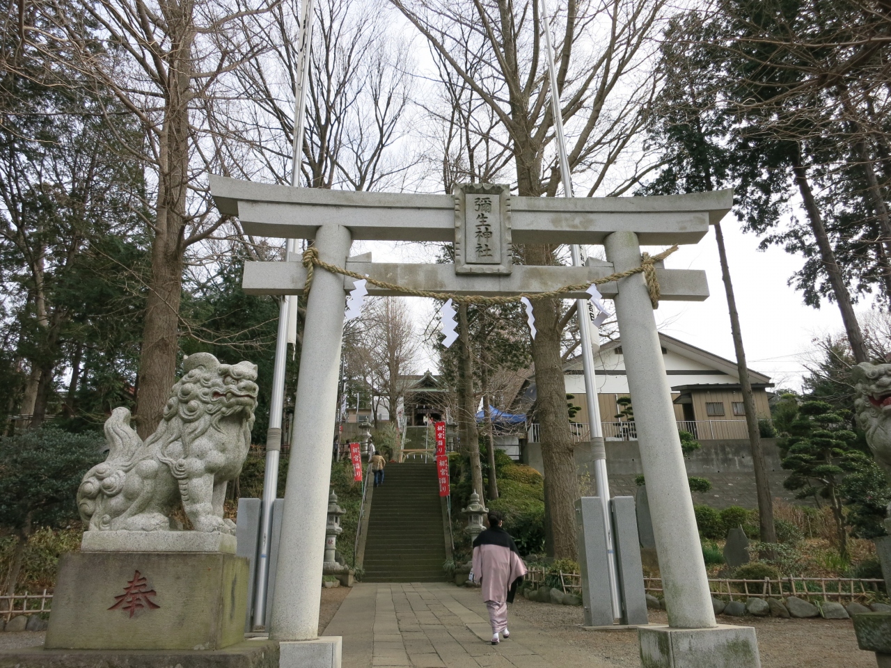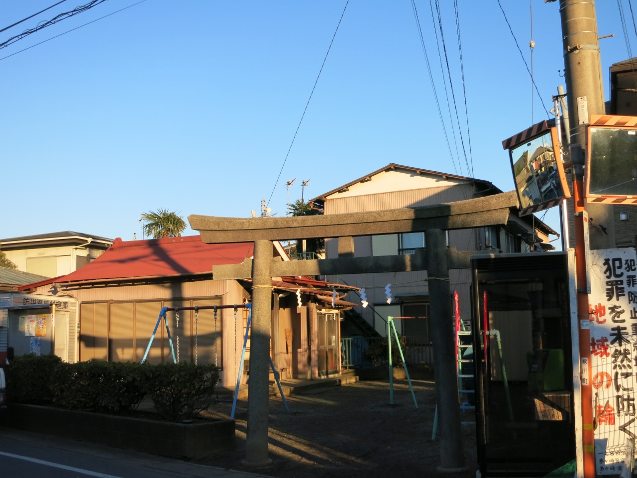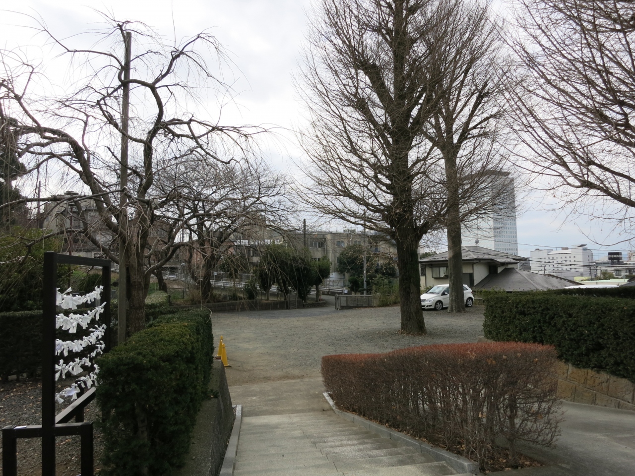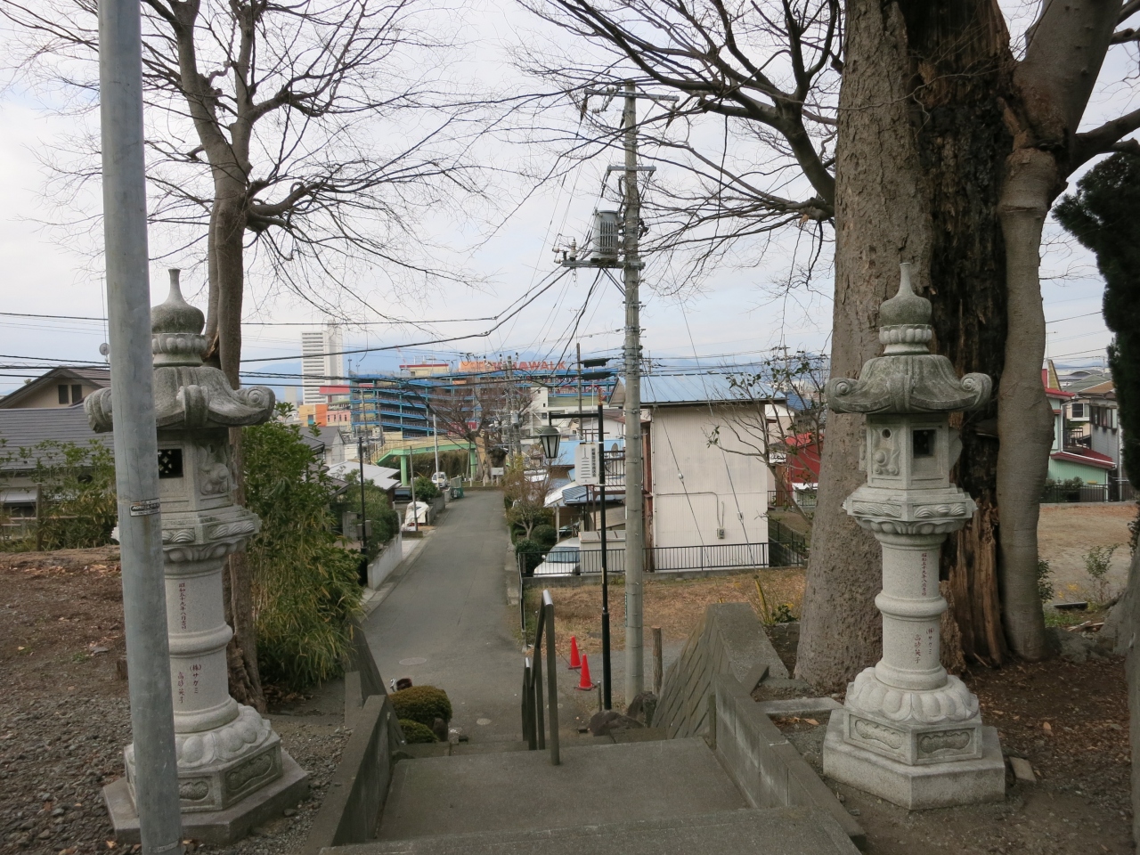 海老名駅の手前の小田急線と相鉄に囲まれたエリアにあります。道幅の狭い県道(407号線)のちょうど小田急線の踏み切りの辺りから参道が始まり、丘陵の上へと石段を登ったところにあります。西側の展望が利き、大山などの眺めがよいです。特に参道は桜並木になっているので、開花の頃はきれいです。