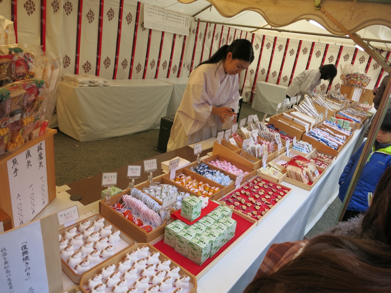 この時期、ショッピングモールの店舗の前や駅の近くなど、人の集まる場所なら、あちこちに注連飾りなどを売る同様の露店が立ちますが、一之宮だるま市はそれらに比べると店も多く、だるまをメインに、注連飾り、神棚や正月飾りの縁起物、そして前述の食べ物の店もあります。