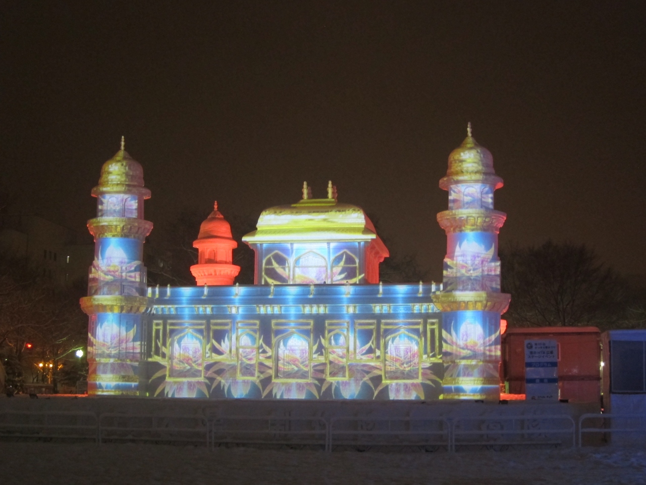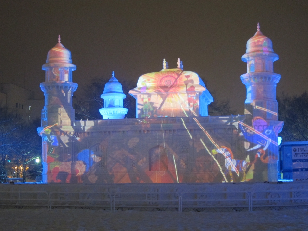 今年はスケートリンク〈貸し靴込みで¥500円〉(1丁目)、氷像のハートの宮殿(2丁目)、ジャンプ台(3丁目)、台湾の建物群(4丁目)、ウィンタースポーツ(5丁目)、マレーシアの建物(7丁目)、イティマド・ウッダウラ〈インド〉(8丁目)、ポンキッキーズ(10丁目)などがあります。このうち、8丁目のイティマド・ウッダウラが美しい3Dマッピングの投影もあり、一番素晴しいと思いました。