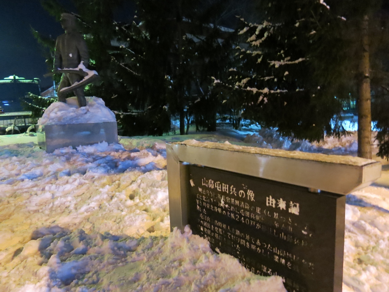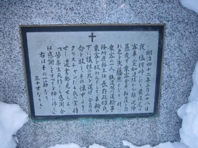 顕彰碑や塩狩駅のある場所は、塩狩峠の頂上近くで、殉難の地はここより3~4km、和寒・名寄側に下ったところらしいです。明治42年(1909年)2月28日夜のことと、碑には記されていました。今では改良された連結器を搭載した列車が行き交う中、静かに佇む雪中の碑がそこにありました。- 旅行時期
