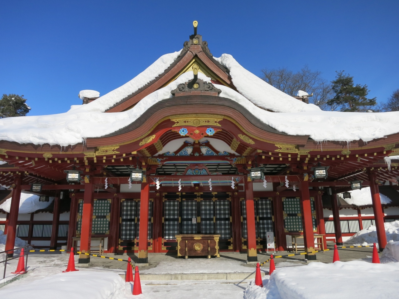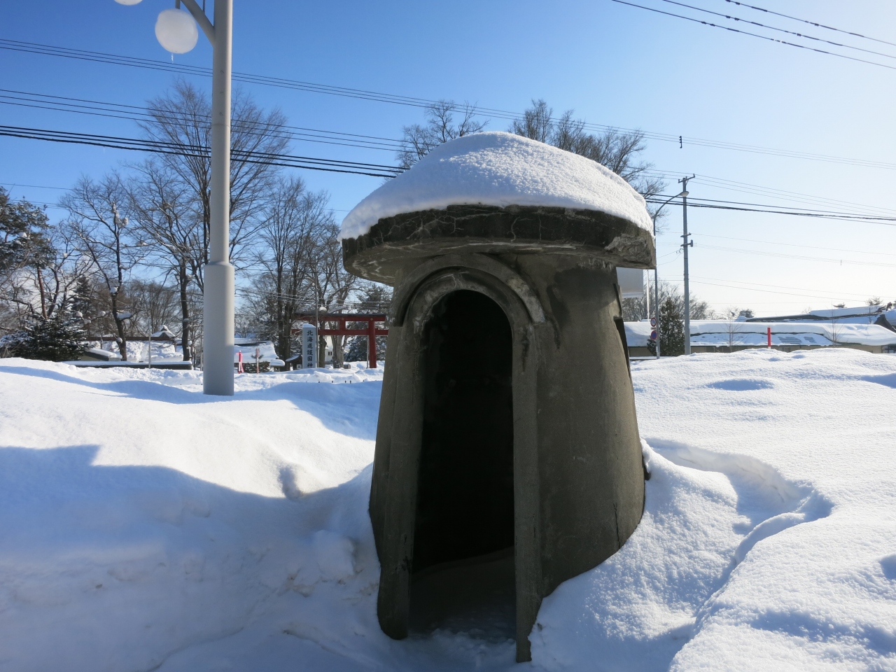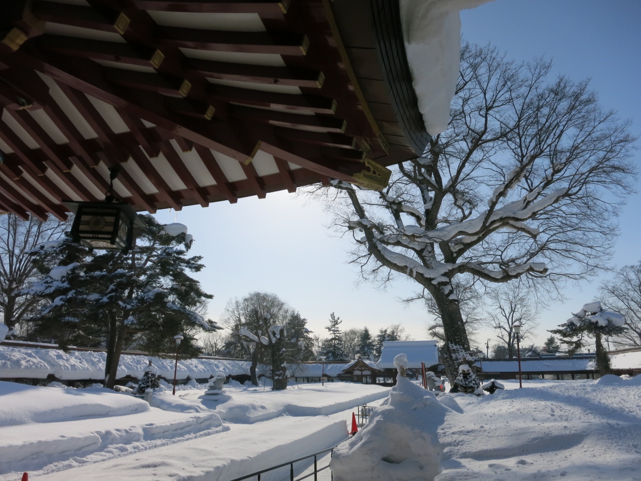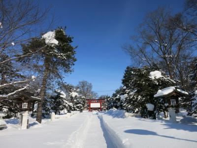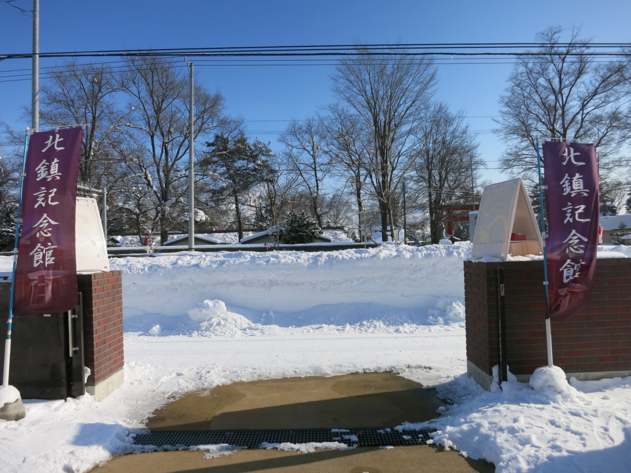 旭川の中心部から旭橋で石狩川を渡った国道40号線沿いにあります。広大な自衛隊旭川駐屯地の向かいで、自衛隊関係者の方の参拝も多そうです。冬に訪れたところ、境内には雪が深々と積もっていましたが、参道はきれいに除雪されていました。