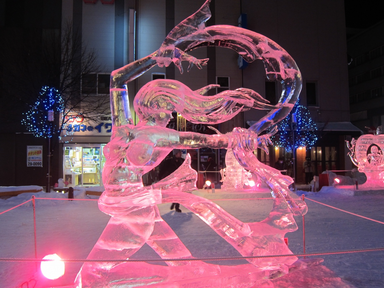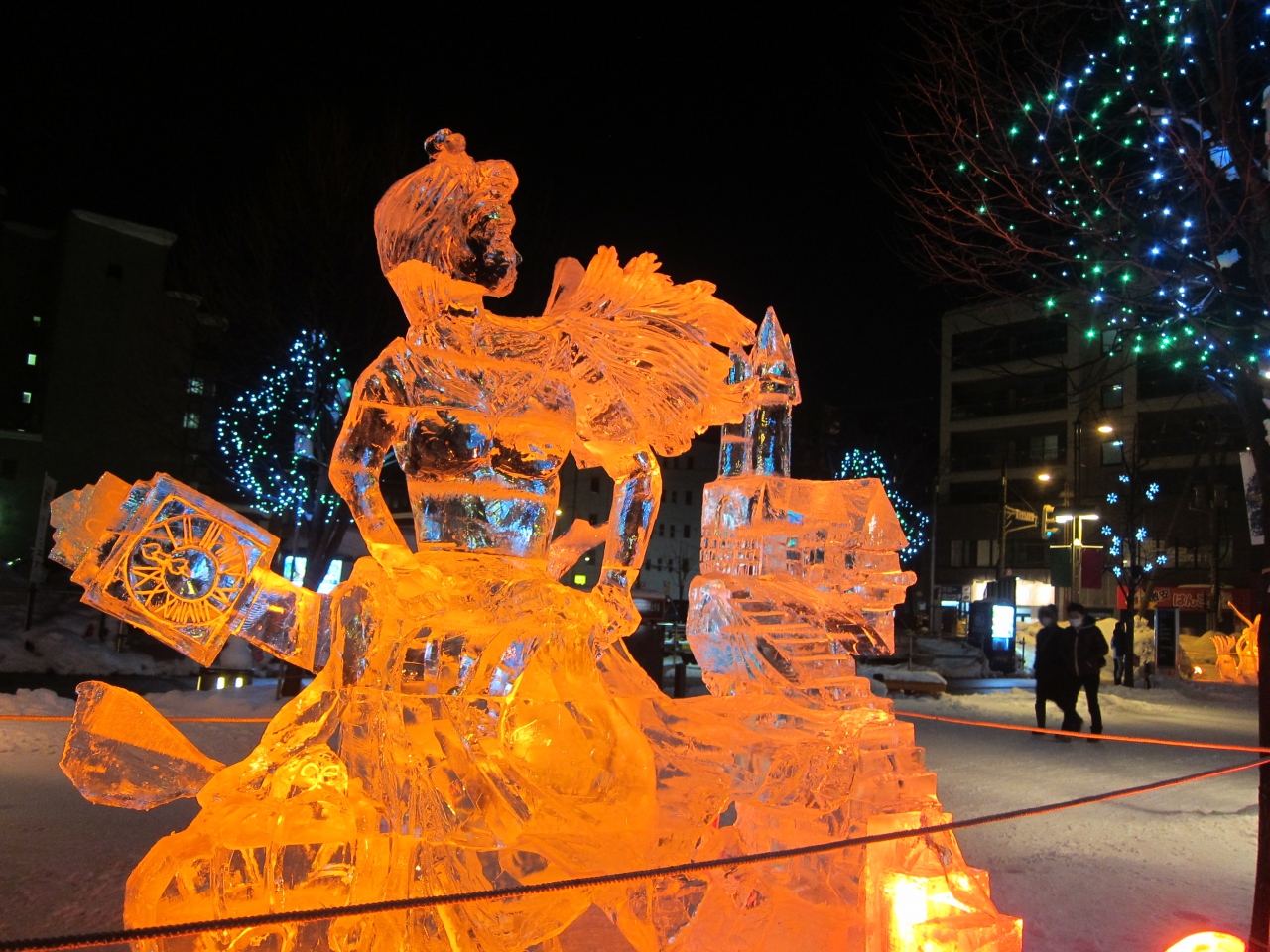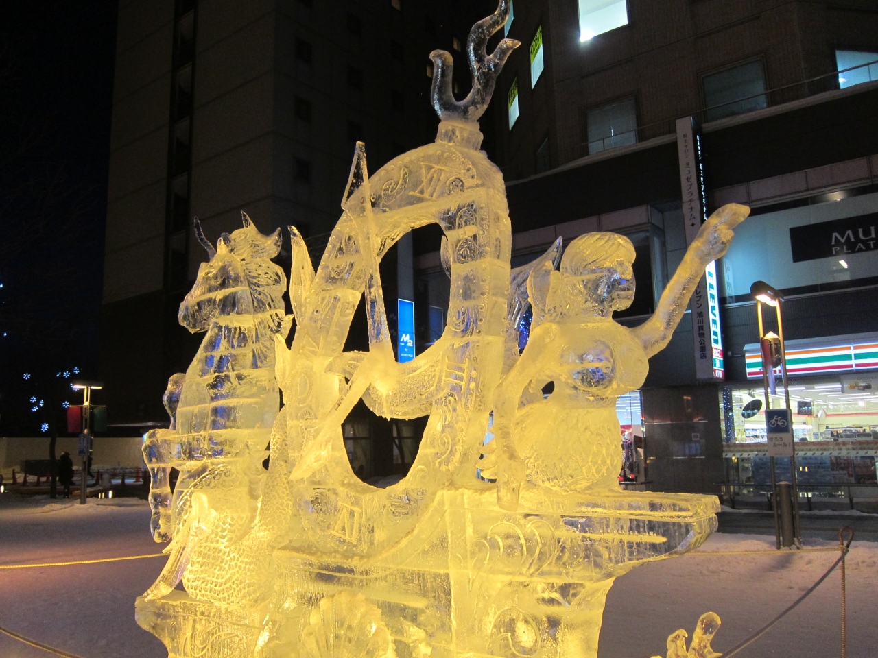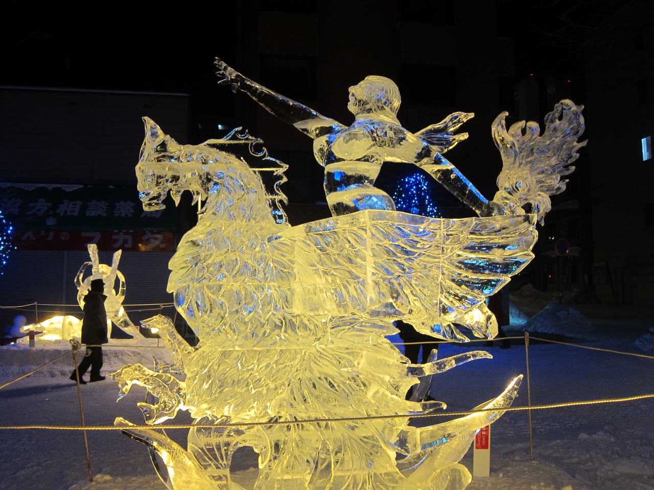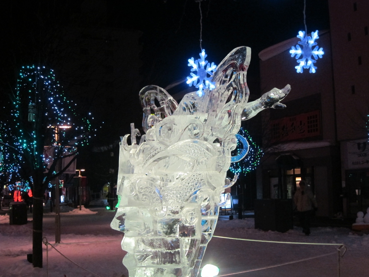 旭川の駅前から平和通買物公園の数百mを氷の芸術が彩ります。青空の下、日の光を反射して輝く氷像も新鮮で美しいですが、特に夜間(~22時)、ライトアップされた時が特に美しいと思います。駅に近い場所のものに素晴しいものが多いような気がしますが、離れたところのものも、なかなか見ごたえがあります。審査結果とは別に、自分のお気に入りの像が見つかるかもしれません。