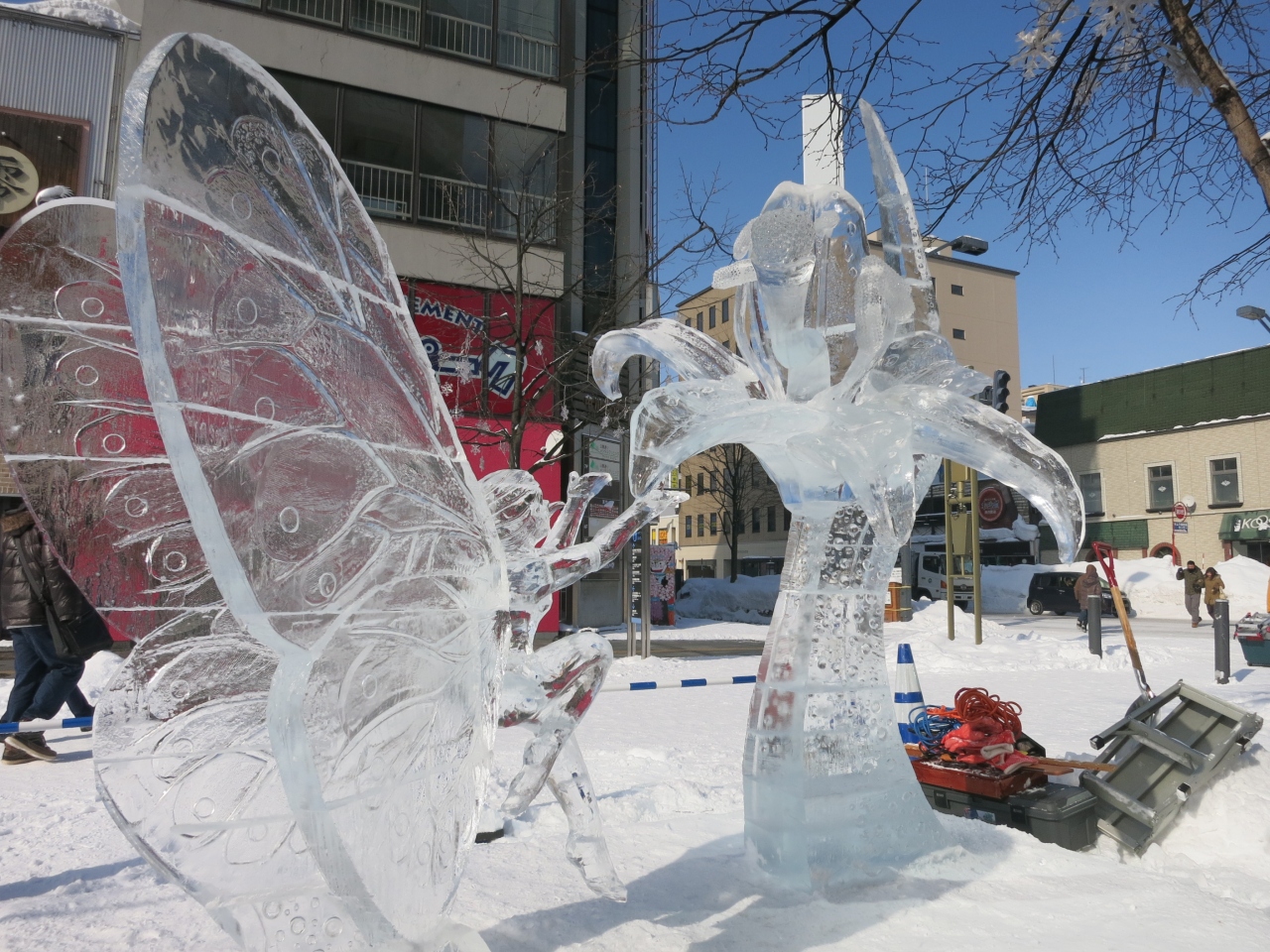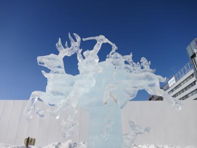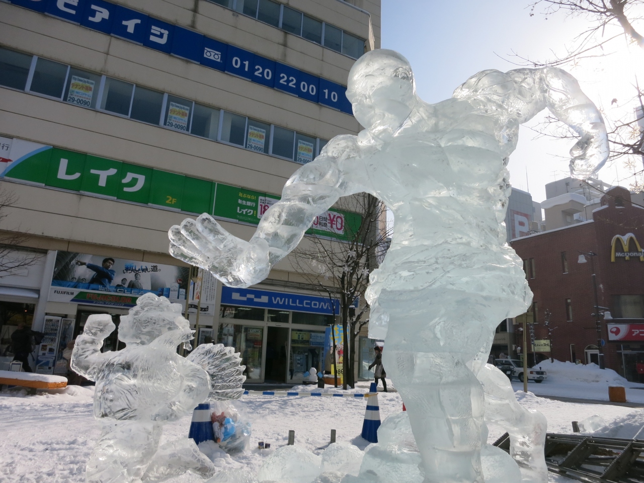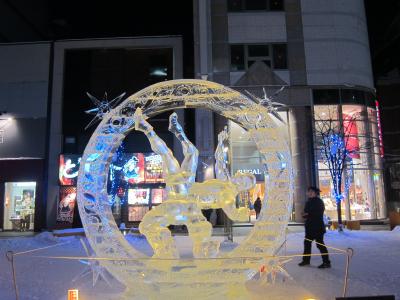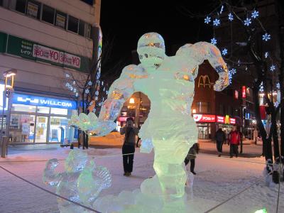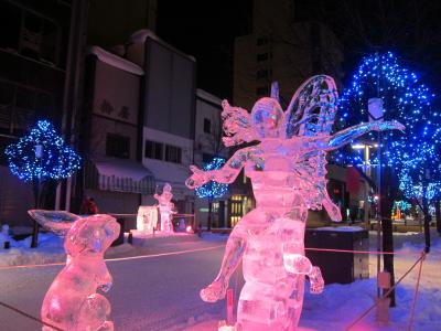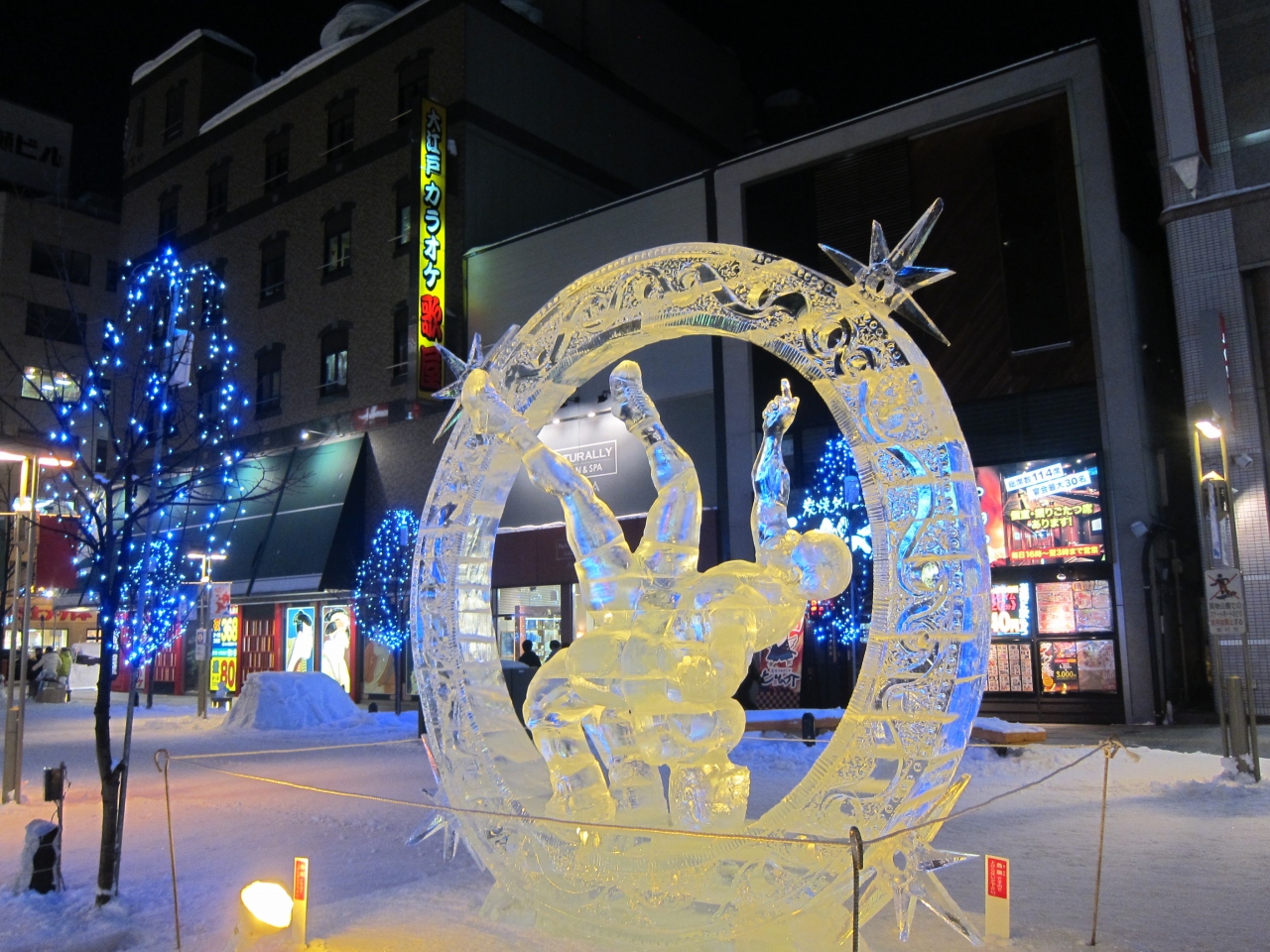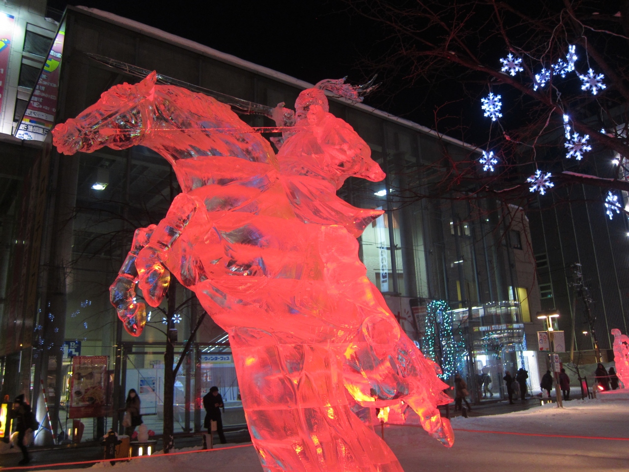 旭川の駅前から平和通買物公園の数百mを氷の芸術が彩ります。青空の下、日の光を反射して輝く氷像も新鮮で美しいですが、特に夜間(~22時)、ライトアップされた時が特に美しいと思います。駅に近い場所のものに素晴しいものが多いような気がしますが、離れたところのものも、なかなか見ごたえがあります。審査結果とは別に、自分のお気に入りの像が見つかるかもしれません。