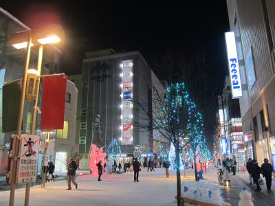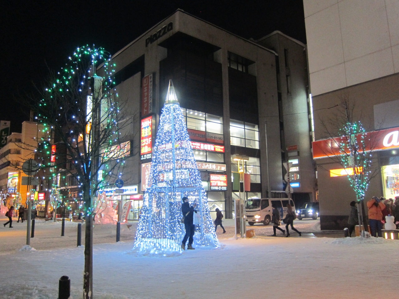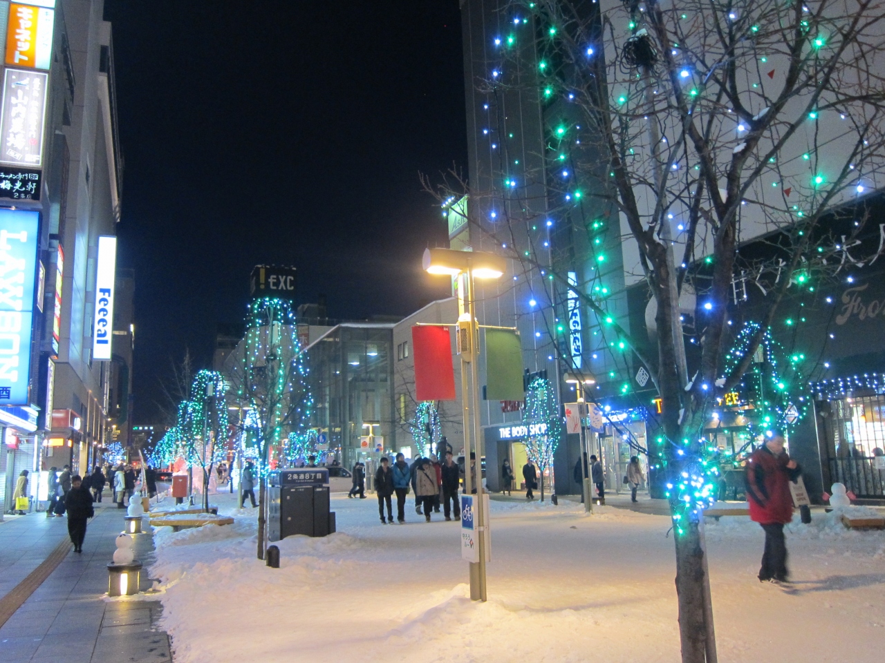 旭川の中心部、平和通買物公園や緑橋通などの冬を彩るイルミネーションです。12月1日から翌年2月11日までのだいたい17時から21時くらいまでです(2014年)。