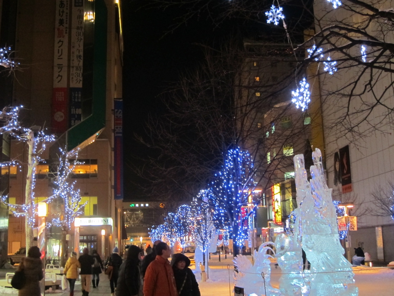 2月6日~11日の旭川冬まつりと旭川氷彫刻世界大会のときが、氷像のライトアップも加わり、おススメです。駅前から8条通までの約1kmあまりをきれいなイルミネーションや美しい氷像が飾ります。