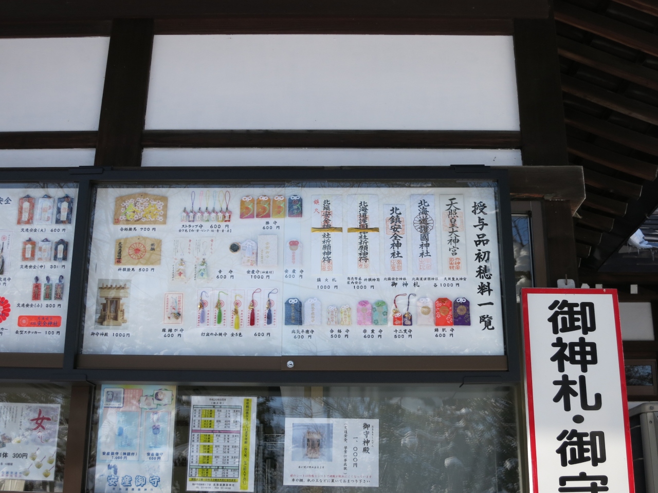 9時から17時まで開いている社務所では、お札、お守りのほか、様々なおみくじがありました。えんみくじ、七福神みくじ、赤みくじ、そして男みくじ、女みくじというものがありました。交通安全関係のお守りも揃っています。反射板やステッカー、吸盤のぶらさげ式の御神鏡守や扇守などがあります。勝守などというのもここ神社のものは強そうです。