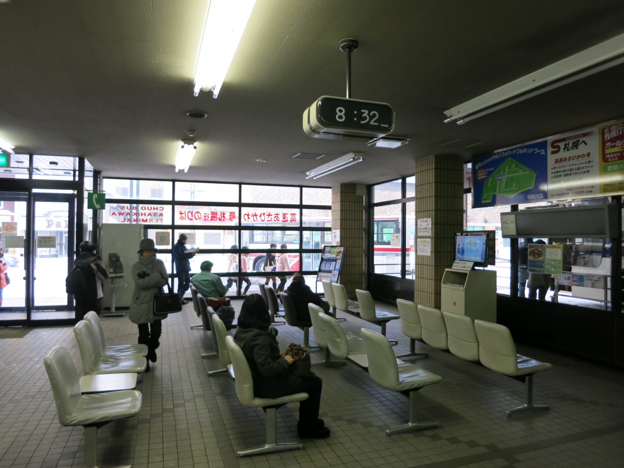 中央バスターミナルの待合室には椅子が並び、切符の販売窓口や飲料の自販機があり、いつもテレビが点いています。比較的安いビジネスホテル(ホテルパコ旭川)が隣接しているので、夜遅い便や朝早くの出発にはとても便利です。- 旅行時期