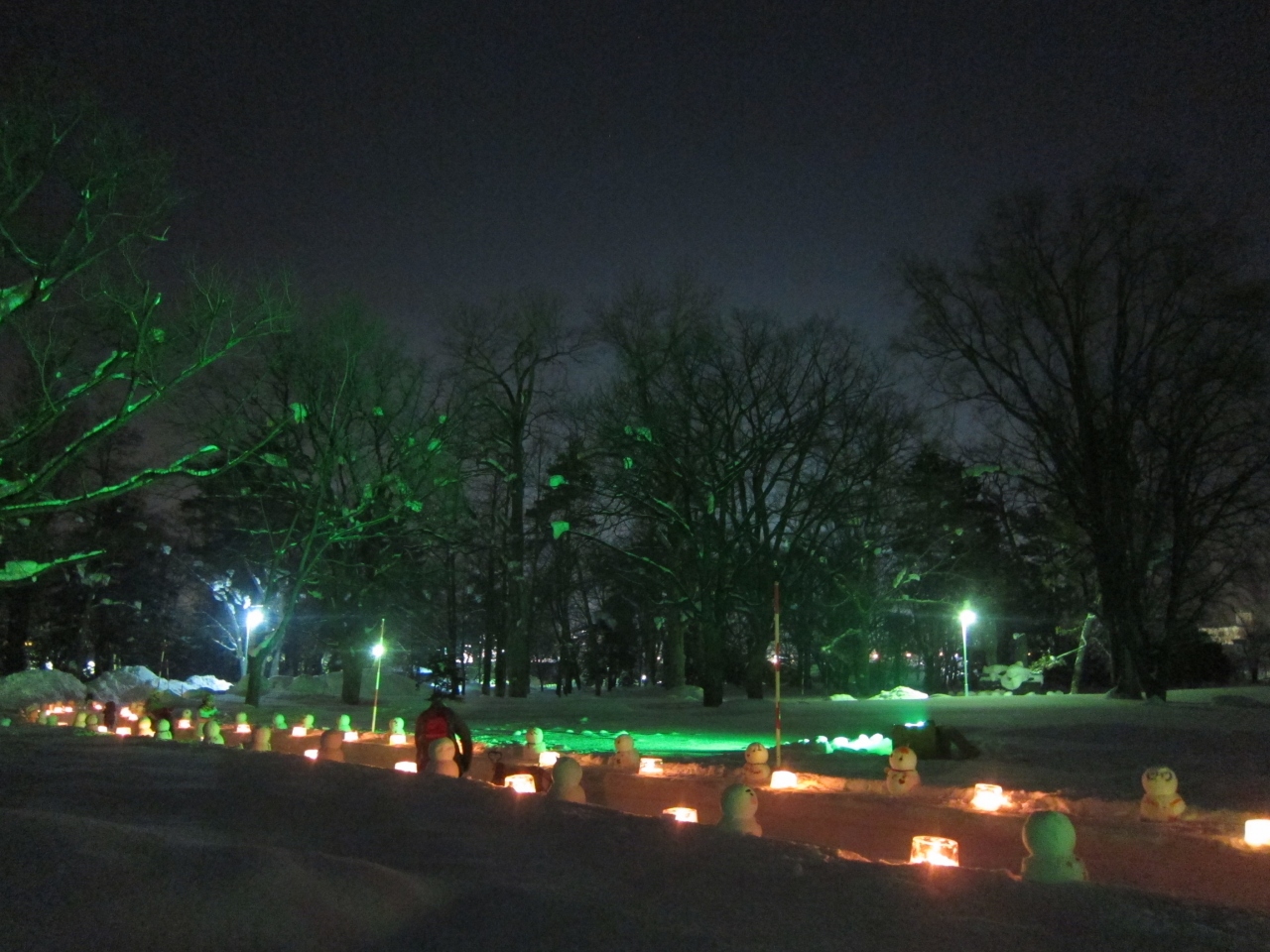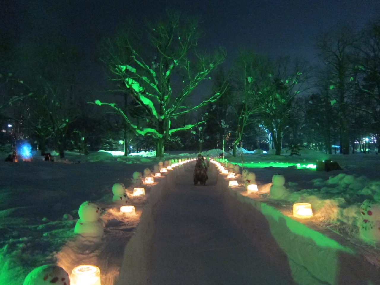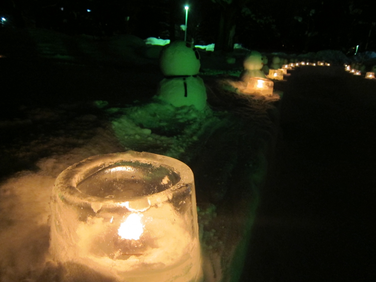 旭川冬まつり(2月6日~11日(2014年))の時に訪れたところ、夜、雪あかりの道を作っていました。火の灯ったキャンドルに、氷や雪などで作った風除けを被せ、河川敷の土手裏から自由広場を抜けて正面出入口へ向かう雪の通路沿いを美しく飾っていました。