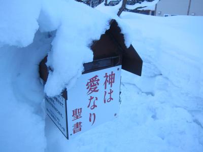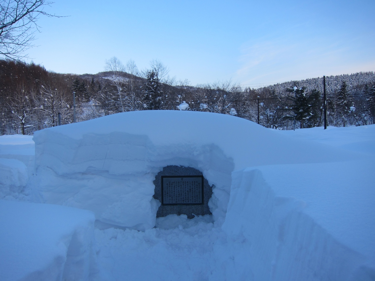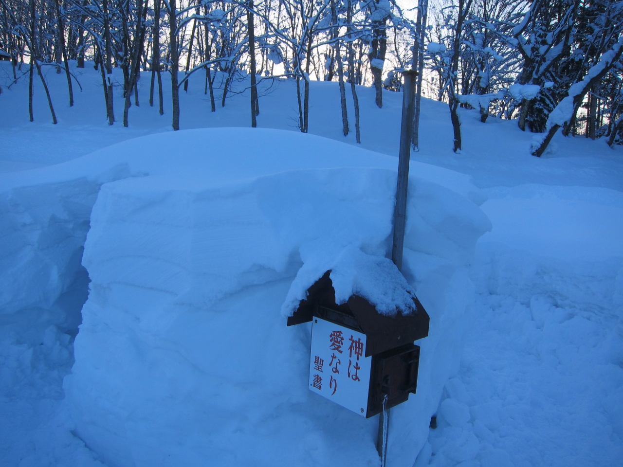 付近を通る国道40号線から塩狩駅までの道は除雪されていましたが、あまりの雪深さにその道路脇にある碑の場所すらもよく分かりません。ところが、ヒュッテの前にわずかに人の手で除雪された人一人分が通れるほどの通路が出来ており、その奥に碑の前面と後面がきれいに除雪された、雪のかまくらのようになった石碑が建っていました。横にはメッセージ受け用のポストもあり、聖書の言葉がしたためられていました。
