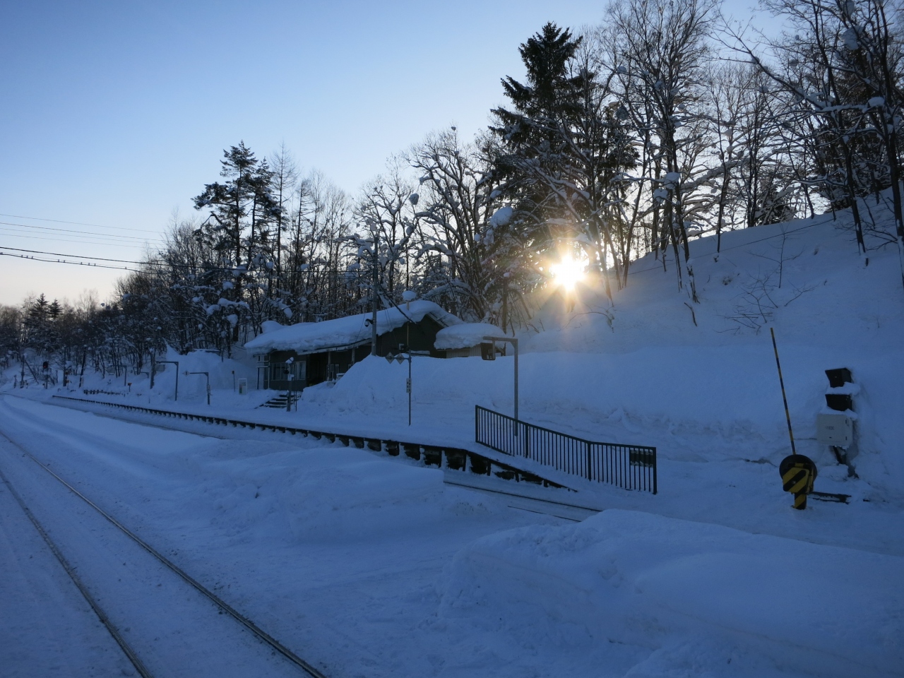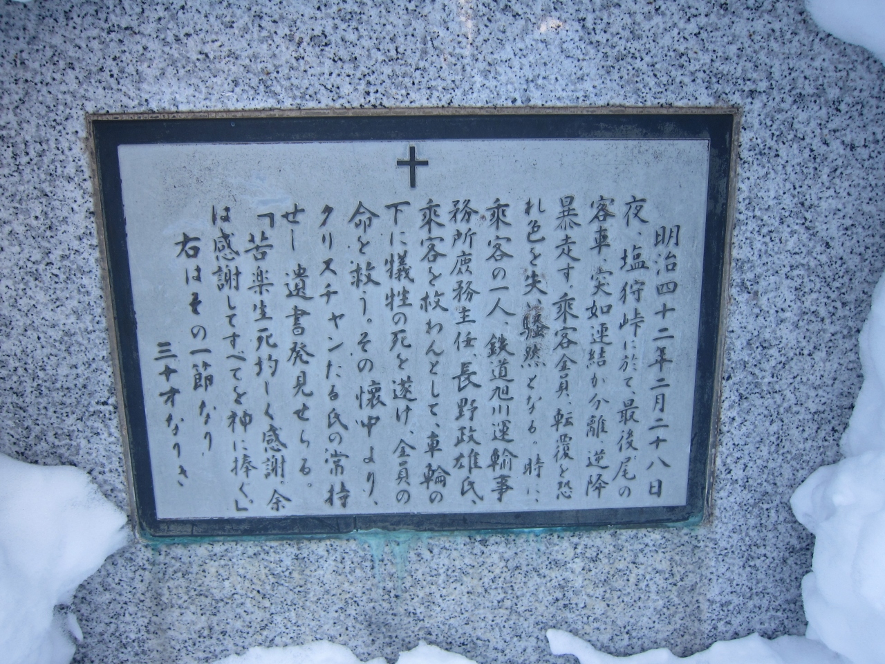 三浦綾子の実話を元にした小説「塩狩峠」の舞台となった場所にある駅です。明治42年(1909年)、いまだ雪深い2月の末、連結器から外れた最後尾の客車の暴走を身を挺して食い止めた長野政雄氏の顕彰碑が、駅から百mほどの線路脇に建てられています。駅は峠の頂上近くにあり、殉難の地はここから名寄側に3~4km下ったところらしいです。
