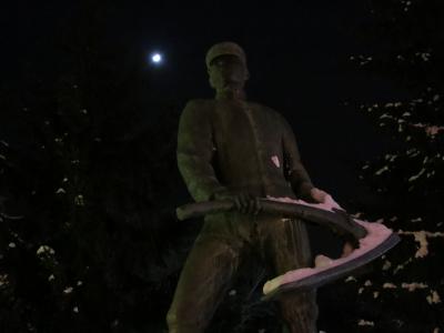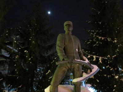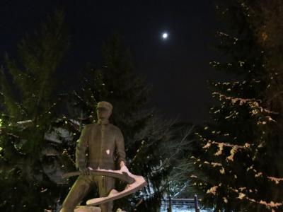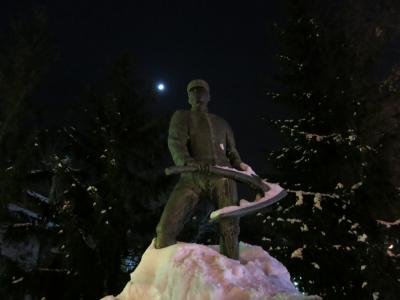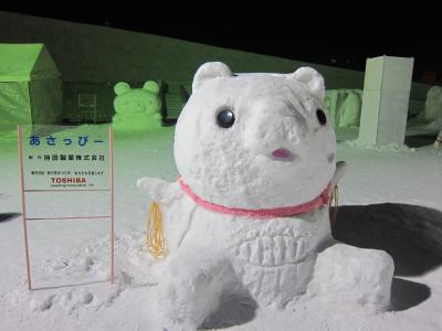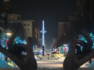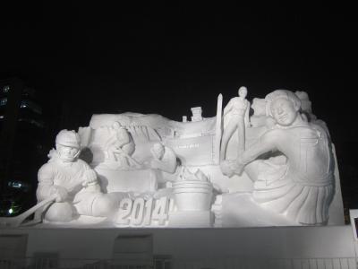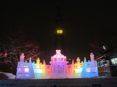 冬まつりの会場へは、昼間は、30分おきに旭川駅とを結ぶ無料シャトルバスが出ています。ただ、各日の祭りの最後のクライマックス、19時、20時の「光と音のシンフォニー」ともなると17時までのシャトルバスは既に終わっていて、マイカー以外の人は、駅の方まで歩く人もいるようです。常盤公園にも一部、人の流れが出来ていて、公園を抜けて7条通を通り、開拓の塔のところで平和通買物公園に入っていました。ちょうど氷彫刻世界大会も同時期に開催されていて、ライトアップされた美しい氷像を見ながら駅まで戻っていました。- 旅行時期