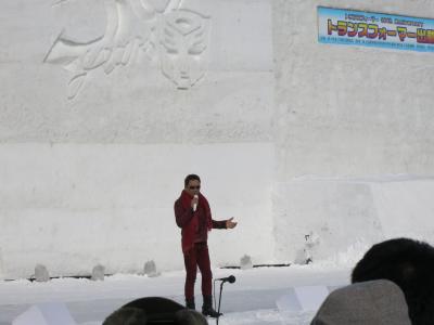 地元の町おこしのお祭りという雰囲気でした。そして、子ども向け(子どものいる家族連れ向け)のアトラクションが数多く用意されています。石狩川の河川敷にある会場には、大雪像?というより、雪でできた大舞台と、そのスクリーンに子ども向け巨大ロボ(トランスフォーマー)の描かれた雪の壁画が、会場に一つドカーンとありました。ロング滑り台も兼ねています。また、会場には、タイヤチューブで土手の雪面を滑り降りたり、スノーモービルが牽引するバナナボートに乗ったり、雪の巨大迷路に挑戦したりと、いずれも子ども達が大はしゃぎしていました。
